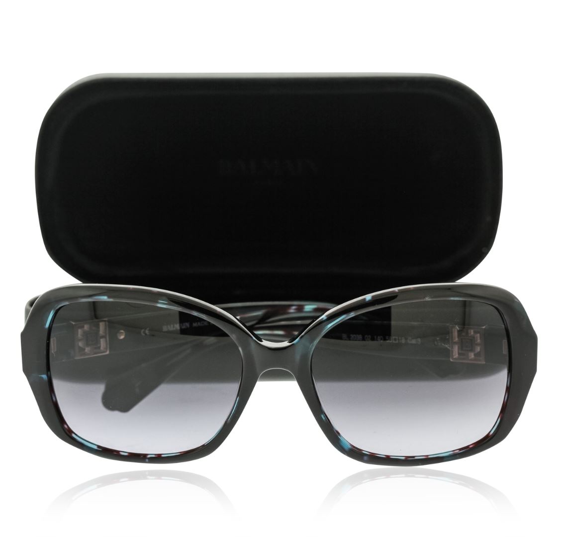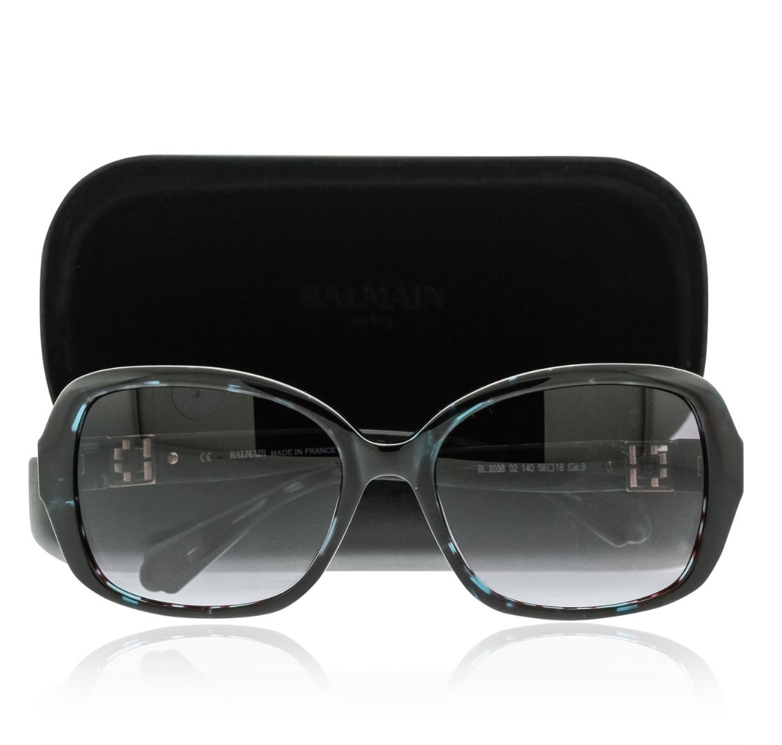 One pair of Balmain blue tortoise sunglasses. Style number BL2038. Includes case, lens cloth, and safety booklet.