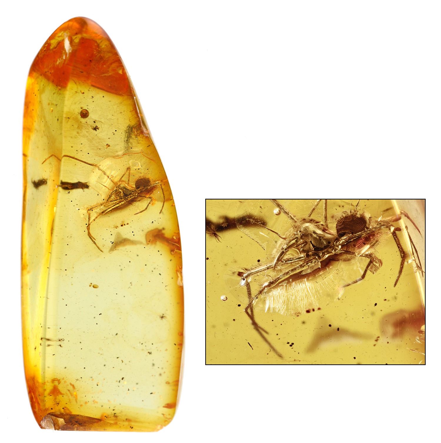 Baltic amber with preserved assassin spider, Paleogene period, approx. 44 million years old, from Kaliningrad, Russia. ¾" long . Very small spider (about 3/8" long) forever entombed in light-orange opaque amber.