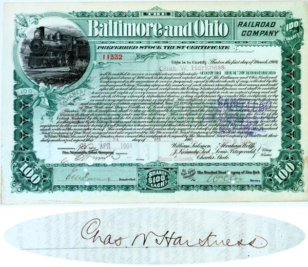 1901, New York. B & O Stock certificate for 100 shares of the Baltimore and Ohio issued to and signed by “Chas. W. Harkness” on verso. Green borders and under printing. Top left engraving of a 4-4-0 locomotive moving down the tracks at full throttle. Stamp and punch cancelled, though not affecting the dark autograph in any way. Fine condition.