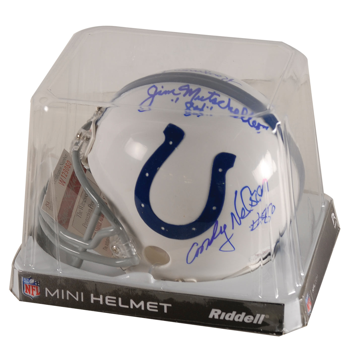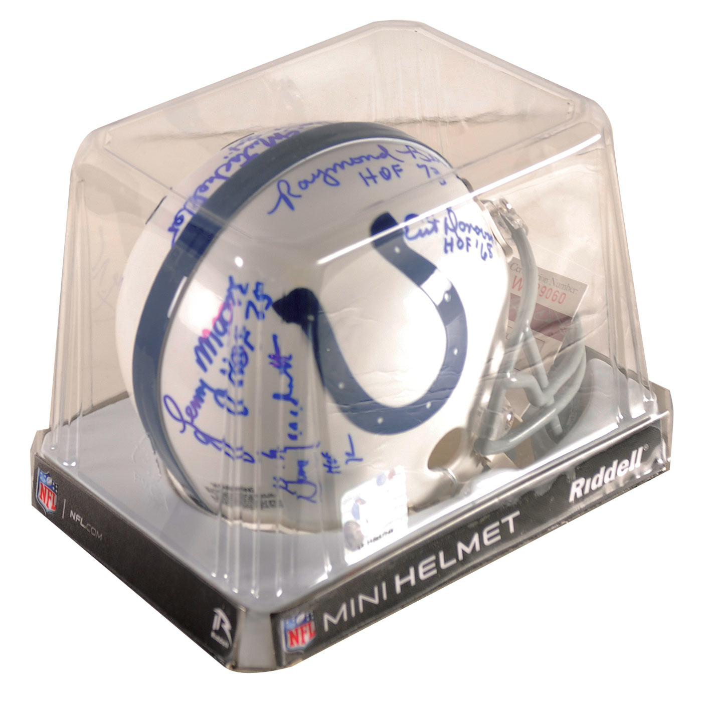 Official Riddell Baltimore Colts football mini-helmet signed in blue felt tip on the sides by Colt Hall of Famers Lenny Moore, Raymond Berry, Art Donovan, Gino Marchetti, Jim Mutscheller, and Andy Nelson. All of the signers have added a Hall of Fame induction year or jersey number. In fine condition. Accompanied by a certificate of authenticity from James Spence.