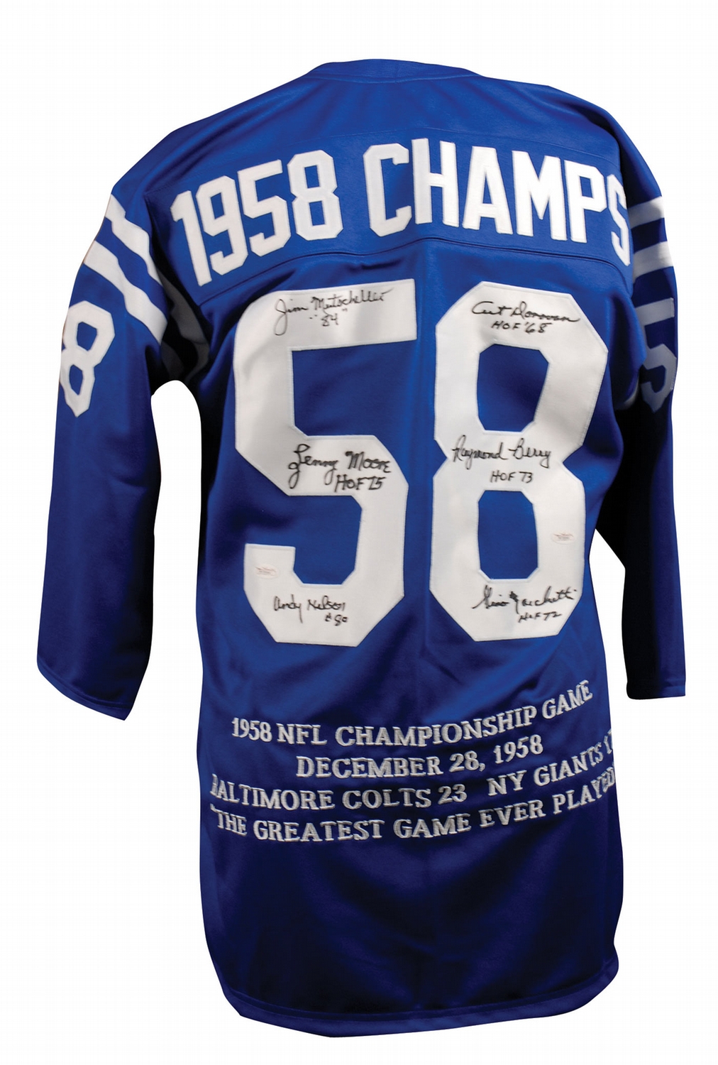Commemorative Baltimore Colts football jersey, honoring the 1958 champions, with sewn on letters and numbers, signed in black felt tip on the number on the back by Art Donovan, Raymond Berry, Lenny Moore, Andy Nelson, Jim Mutscheller, and Gino Marchetti. In fine condition.