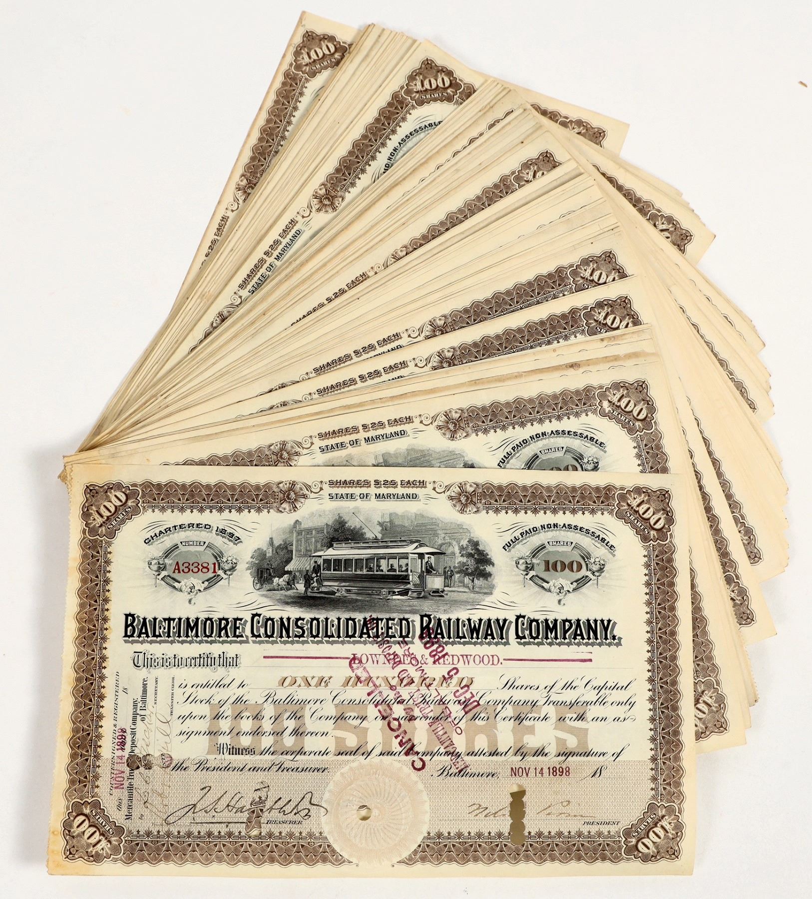 Over 75 issued stock certificates from the Baltimore Consolidated Railway Company. Brown ink, street car vignette, some revenue stamps. All dated 1898.