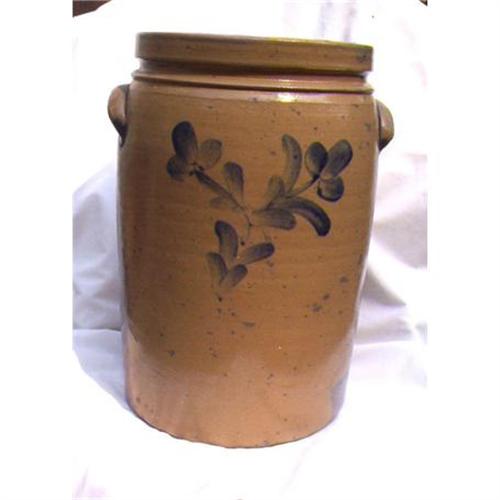 Very nice Baltimore crock made by Peter Herman. Brown/grey putty color with blue design. There are 2 chips on the side and a couple hairline cracks that you have to look for to see them. The number 3 is stamped on one side by the handle. I have a close up of the design on the front. If you would like to see it feel free to email.