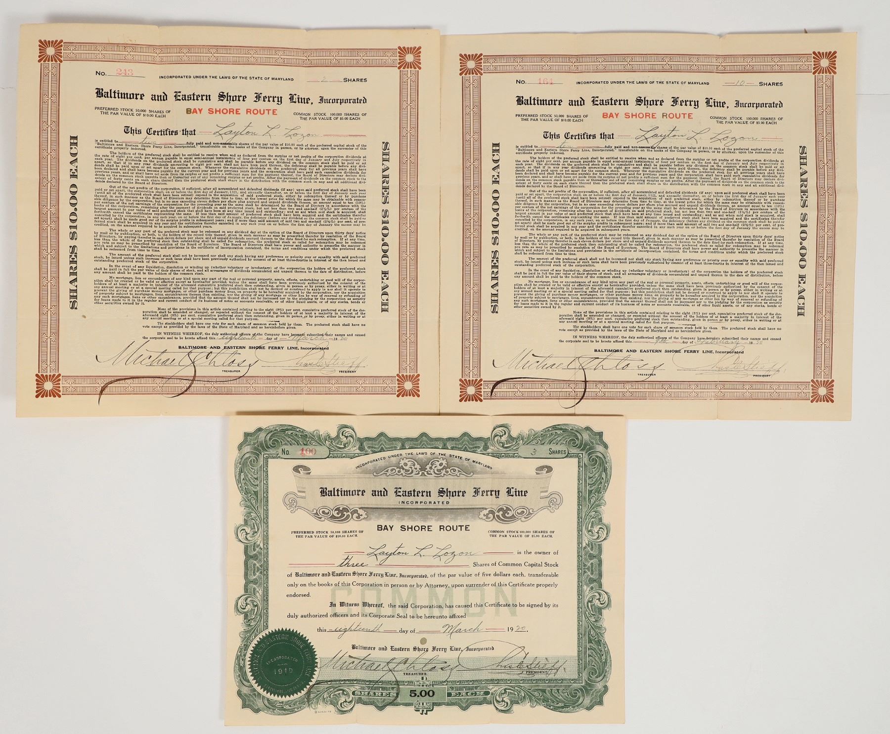 Group of 3 stocks from the Baltimore and Eastern Shore Ferry Line, all dated 1920. All three issued to Layton L. Logan, all uncancelled. Signed by treasurer Michael (?) and president Charles Stieff, all w/ embossed company seal. 1x green and 2x brown certificate. Some creasing and toning, fine condition overall; see photos.