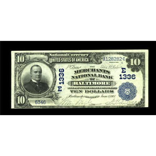 <B>Baltimore, MD</B></I> - $10 1902 Date Back Fr. 616 <B>The Merchants NB</B></I> Ch. # (E)1336<BR> This piece has one fold too many for a full EF grade. It is wholly original with solid embossing and bright white paper. <B>Very Fine-Extremely Fine.</B></I><BR><BR><b>Shipping:</b> Coins & Currency (<a target="_blank" href="http://www.heritageauctions.com/common/shipping.php">view shipping information</a>)