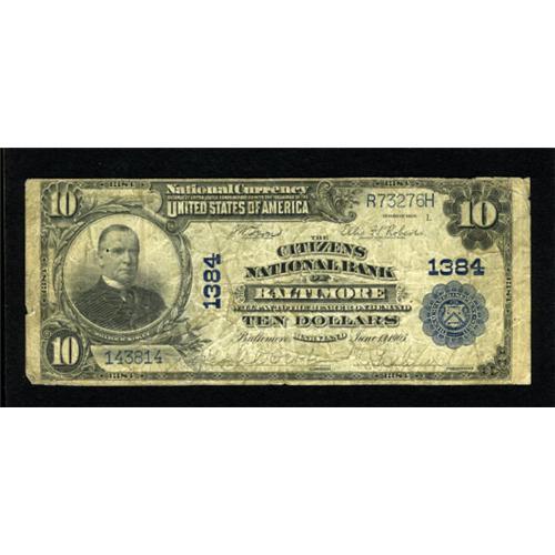<B>Baltimore, MD</B></I> - $10 1902 Plain Back Fr. 624 <B>The Citizens NB</B></I> Ch. # 1384<BR> A decently original note that has some holes, none of which is bigger than a pencil head. <B>Very Good.</B></I><BR><BR><b>Shipping:</b> Coins & Currency (<a target="_blank" href="http://www.heritageauctions.com/common/shipping.php">view shipping information</a>)
