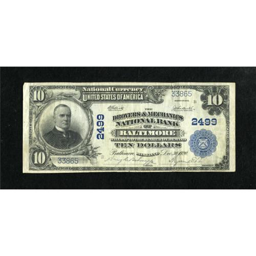 <B>Baltimore, MD</B></I> - $10 1902 Plain Back Fr. 633 <B>The Drovers & Mechanics NB</B></I> Ch. # 2499<BR> The paper is perfectly original and attractive for the grade. A few pinholes are noted in the left margin, but were almost missed when we first viewed this piece. <B>Very Fine.</B></I><BR><BR><b>Shipping:</b> Coins & Currency (<a target="_blank" href="http://www.heritageauctions.com/common/shipping.php">view shipping information</a>)