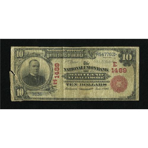 <B>Baltimore, MD</B></I> - $10 1902 Red Seal Fr. 613 <B>The National Union Bank of Maryland</B></I> Ch. # (E)1489<BR>This is only the second Red Seal to turn up from here in the past couple of years. A torn section at lower left has been fixed with brown tape. <B>Good-Very Good.</B></I><BR><BR><b>Shipping:</b> Coins & Currency (<a target="_blank" href="http://www.heritageauctions.com/common/shipping.php">view shipping information</a>)