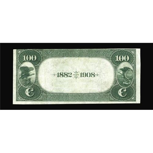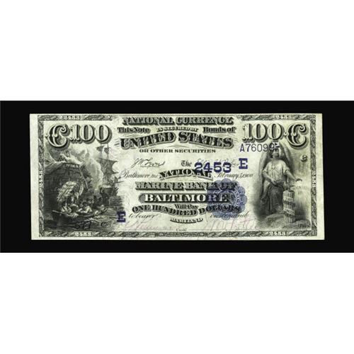 <B>Baltimore, MD</B></I> - $100 1882 Date Back Fr. 571 <B>The National Marine Bank</B></I> Ch. # (E)2453<BR>While listed in the census for many years, this auction marks the first time that this extraordinary note has been offered at public sale to the collecting public. Series 1882 $100 Date Backs were issued by only a handful of banks in Maryland, with a total issue of just 4900 pieces for all banks combined. This is the sole survivor reported to date. Fortunately for collectors, it is as nice as it is rare, grading a bright <B>Very Fine-Extremely Fine</B></I> with good color and body along with easily visible purple signatures. We truly haven't a clue what this unique note will realize this evening, but we do know that after the hammer falls tonight one collector and one collector only will be able to boast that he owns a complete type set from this avidly collected state.