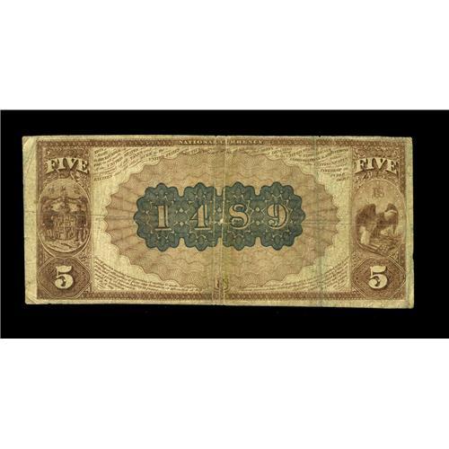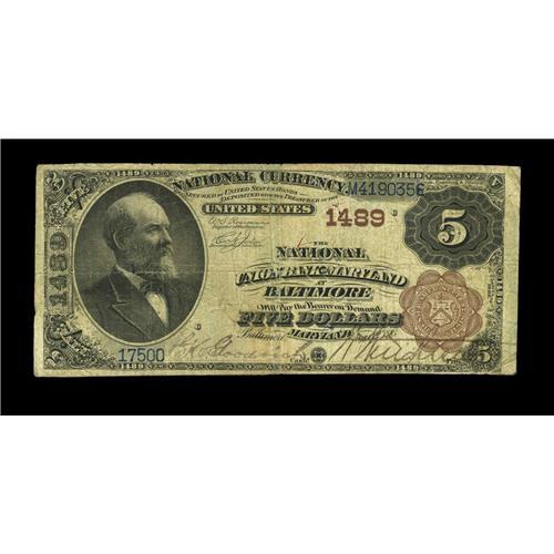 <B>Baltimore, MD</B></I> - $5 1882 Brown Back Fr. 469 <B>The National Union Bank of Maryland at Baltimore</B></I> Ch. # 1489<BR>Although over 60 large size survivors are known from here, this <B>Fine</B></I> $5 Brown Back is one of only seven of its type and denomination now documented. It is well centered and retains the stamped signatures of the officers.