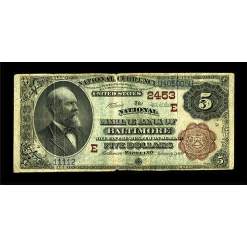 <B>Baltimore, MD</B></I> - $5 1882 Brown Back Fr. 477 <B>The National Marine Bank</B></I> Ch. # (E)2453<BR> A tougher early note from here, with this just the third $5 Brown Back reported to date. <B>Fine, </B></I>with a bit of light soil on the face. <BR><BR><b>Shipping:</b> Coins & Currency (<a target="_blank" href="http://www.heritageauctions.com/common/shipping.php">view shipping information</a>)