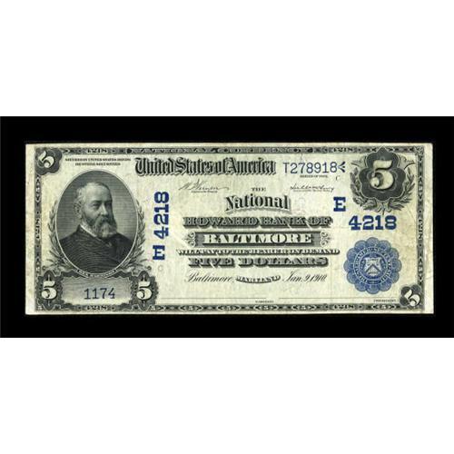 <B>Baltimore, MD</B></I> - $5 1902 Date Back Fr. 593 <B>The National Howard Bank</B></I> Ch. # (E)4218<BR> This note comes from one of the rarest of Baltimore's banks, as this institution not only was in business for a limited period through 1915 but elected to issue fifties and hundreds only until its small Third Charter Date Back output. This $10 Date Back is part of the census which now stands at five pieces. <B>Fine</B></I>.<BR><BR><b>Shipping:</b> Coins & Currency (<a target="_blank" href="http://www.heritageauctions.com/common/shipping.php">view shipping information</a>)