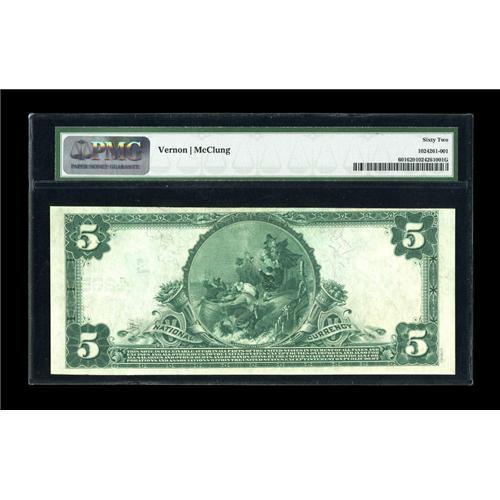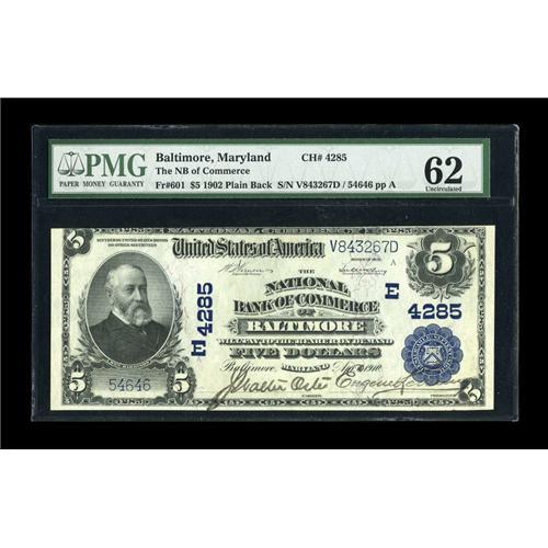 <B>Baltimore, MD</B></I> - $5 1902 Plain Back Fr. 601 <B>The NB of Commerce</B></I> Ch. # (E)4285<BR>As is so often the case from here a tightly trimmed top margin has limited the grade of this piece. Graded <B>PMG Uncirculated 62,</B></I> it has bright white surfaces and deeply stamped signatures.<BR><BR><b>Shipping:</b> Coins & Currency (<a target="_blank" href="http://www.heritageauctions.com/common/shipping.php">view shipping information</a>)