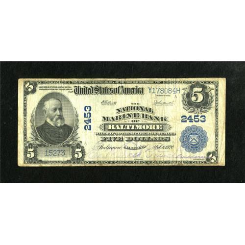<B>Baltimore, MD</B></I> - $5 1902 Plain Back Fr. 607 <B>The National Marine Bank</B></I> Ch. # 2453<BR> The signatures have almost faded from this $5. <B>Fine+</B></I>.<BR><BR><b>Shipping:</b> Coins & Currency (<a target="_blank" href="http://www.heritageauctions.com/common/shipping.php">view shipping information</a>)
