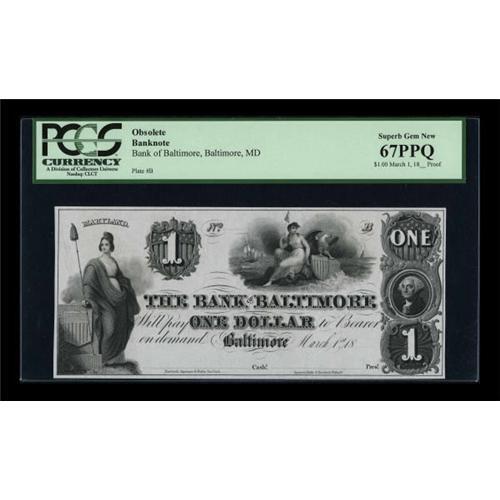 <B>Baltimore, MD- The Bank of Baltimore</B></I> $1 18__ G24a Shank 5.5.18P Proof<BR> This is the first time that we have entertained a Proof on this rare bank. <B>PCGS Superb Gem New 67PPQ.</B></I><BR><BR><b>Shipping:</b> Coins & Currency (<a target="_blank" href="http://www.heritageauctions.com/common/shipping.php">view shipping information</a>)