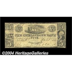 Baltimore, MD- The Chesapeake Bank $5 Oct. 1, 1861 G12b Shank 5.25.19An extremely rare signed and issued example. Nice Fine. <BR><BR><B>Important notice:</B> Heritage usually auctions material at the rate of 200-250 lots per hour. On some occasions eBay Live bid software or the Internet may not be able to keep up with the pace of the auction. We recommend placing a realistic absentee bid now as insurance to avoid disappointment. Occasionally the auctioneer may eliminate or reject an eBay Live bid, and the auctioneer may also reopen a lot after the close of the eBay live bidding (usually because we missed an audience bid), and may reject your bid even if it shows you as the winning bidder. By bidding via eBay Live, you agree that Heritage may award the lot to another bidder at its sole discretion under the circumstances described above or any other reasonable circumstances. Since eBay bids are not shown to us until we open the lot on the floor, we treat those bids just like floor bids. In most cases the floor responds before the eBay bid is presented to us, due to Internet lag time, so for consistency we have made it a policy that floor bids are always considered first over tie eBay live bids. Also please note that all Heritage lots purchased through eBay Live carry a 20% Buyer's Premium. Please make sure you read the Terms and Conditions before you bid. <BR><BR><B>IMPORTANT ANNOUNCEMENT ABOUT RESERVES:</B> Heritage now divulges all reserves on its web site 7 days before every auction. If you want to know whether the reserve on this lot has been met, and if not, what the reserve amount is, please visit this lot page on the HeritageCoin.com web site, or email: bid@HeritageGalleries.com