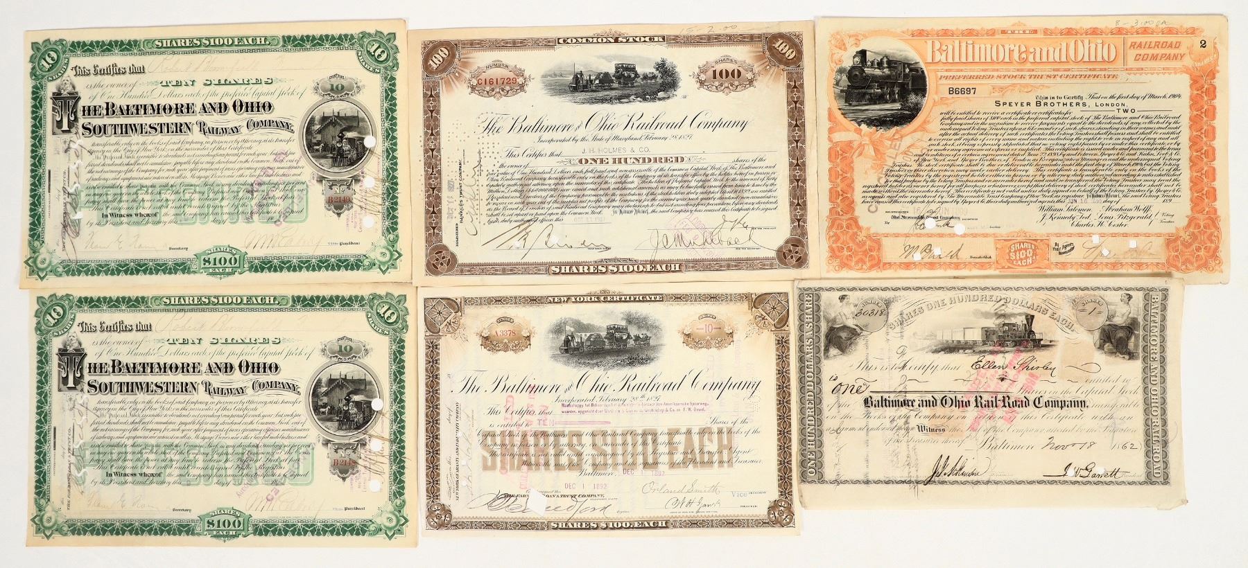 Group of 6 stock certificates from the Baltimore and Ohio Railroad Company/Baltimore and Ohio Southwestern Railway Company, issued 1862 to 1927. All issued and cancelled. Lot contains 5 different certificate varieties. Nice locomotive vignettes, including an interesting early train. Varying condition; see photos.