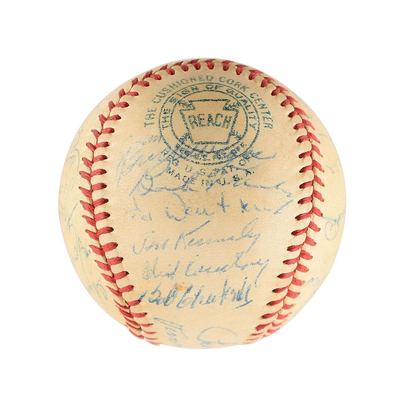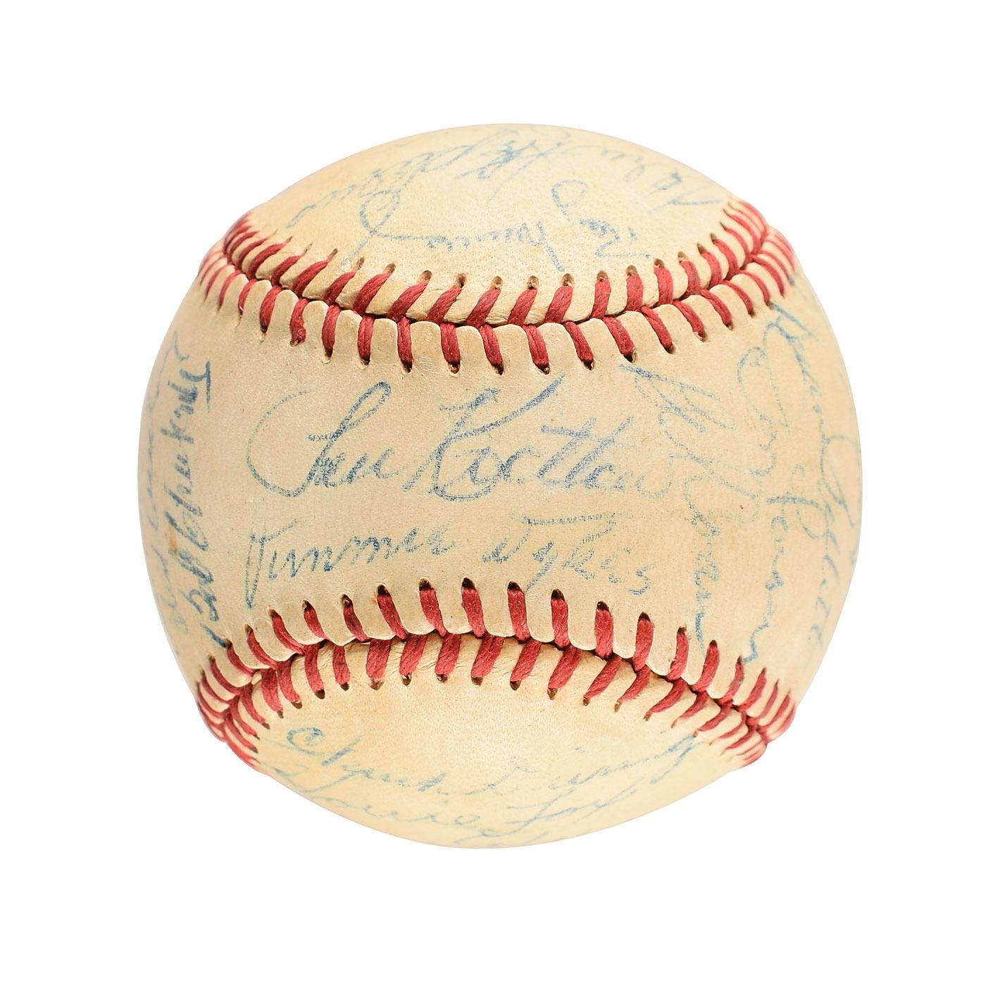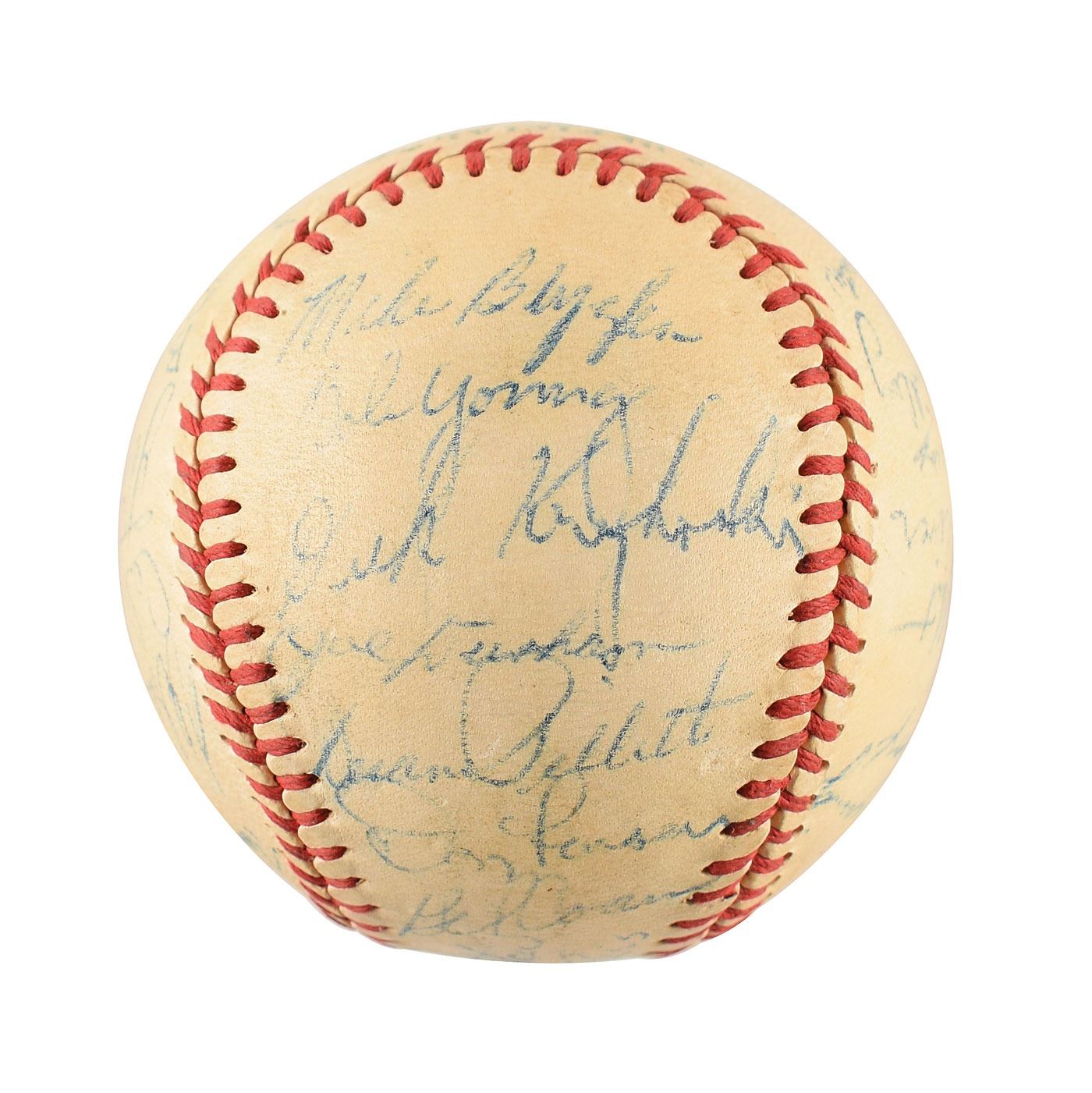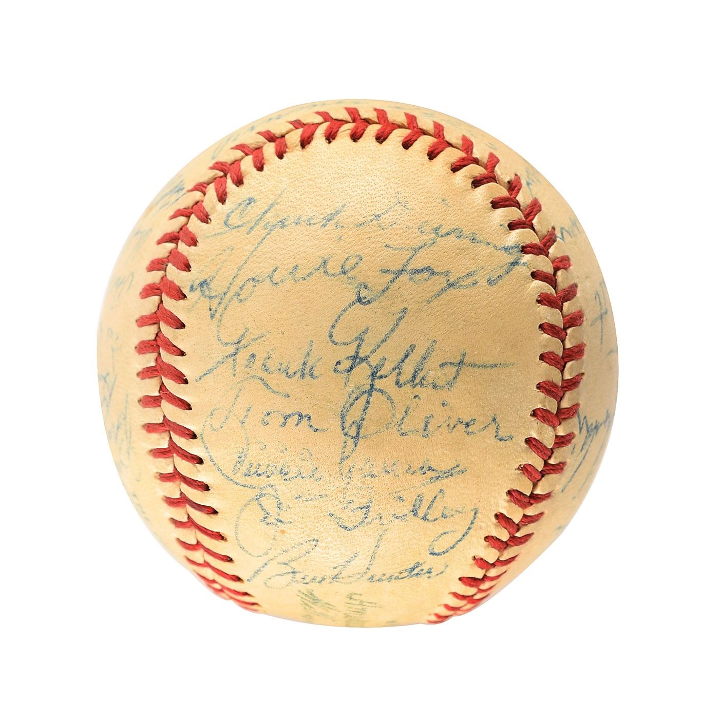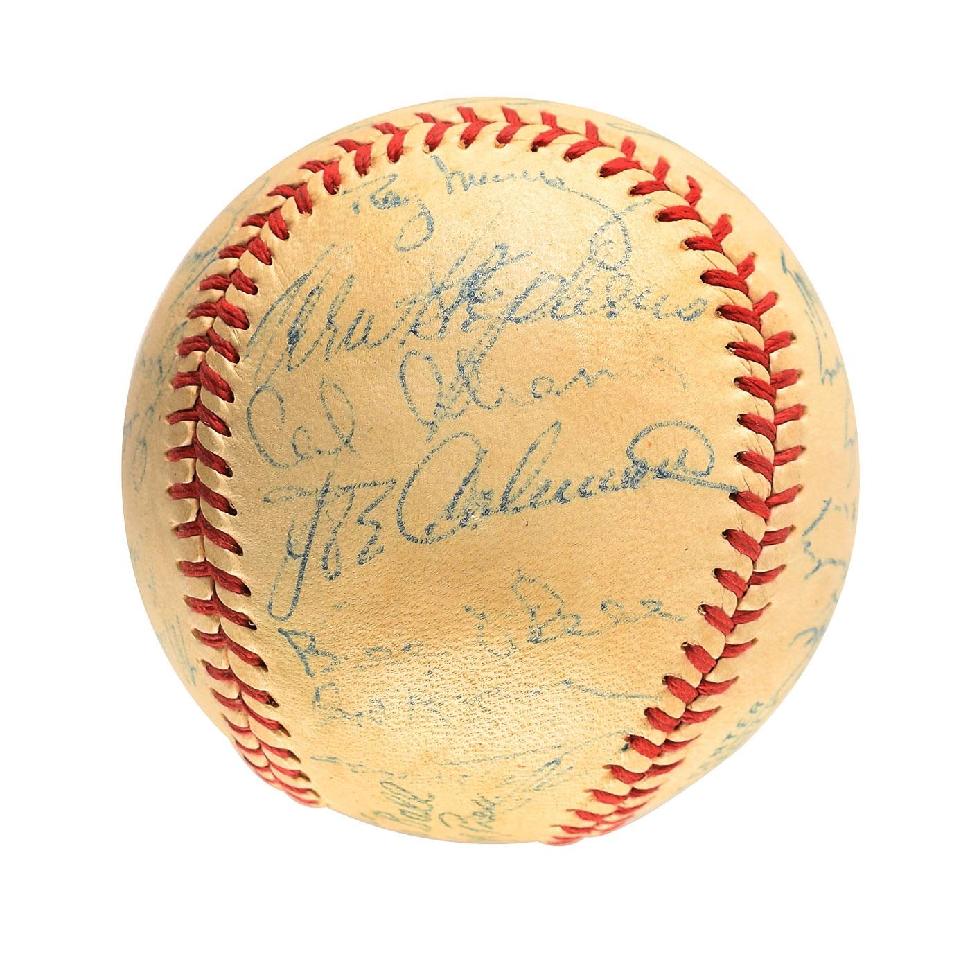 Official Reach American League (Harridge) baseball signed in blue ballpoint on the sweet spot and side panels by 29 members of the 1954 Baltimore Orioles team, including: Don Larsen, Vern Stephens, Cal Abrams, Jimmie Dykes (ss), Eddie Waitkus, Bob Kennedy, Bob Chakales, Mike Blyzka, Bob Young, Dick Kryhoski, Duane Pillette, Gil Coan, Ray Murray, Joe Coleman, Billy O'Dell, Chuck Diering, Howie Fox, Frank Kellert, Tom Oliver, Chico Garcia, Jim Fridley, Billy Hunter, and others. In fine condition, with light overall soiling.