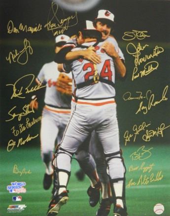 The 1983 Baltimore Orioles finished 1st in the American League East with a record of 98 wins and 64 losses. The season culminated with the winning of the 1983 World Series over the Philadelphia Phillies. The following members of the 1983 Baltimore Orioles have autographed this 83 WS Champs 16x20 Photo: Rick Dempsey, Jim Palmer, Joe Altobelli, Scott McGregor, Mike Boddicker, Paul Mirabella, Dan Morogiello, Sammy Stewart, Bill Swaggerty, Joe Nolan, Bobby Bonner, Glenn Gulliver, Benny Ayala, Dan Ford, Tito Landrum, John Lowenstein, Gary Roenicke, and Michael Young. Rick Dempsey has added the inscription, “MVP.” Schwartz Sports Hologram and Certificate of authenticity from Athlon Sports