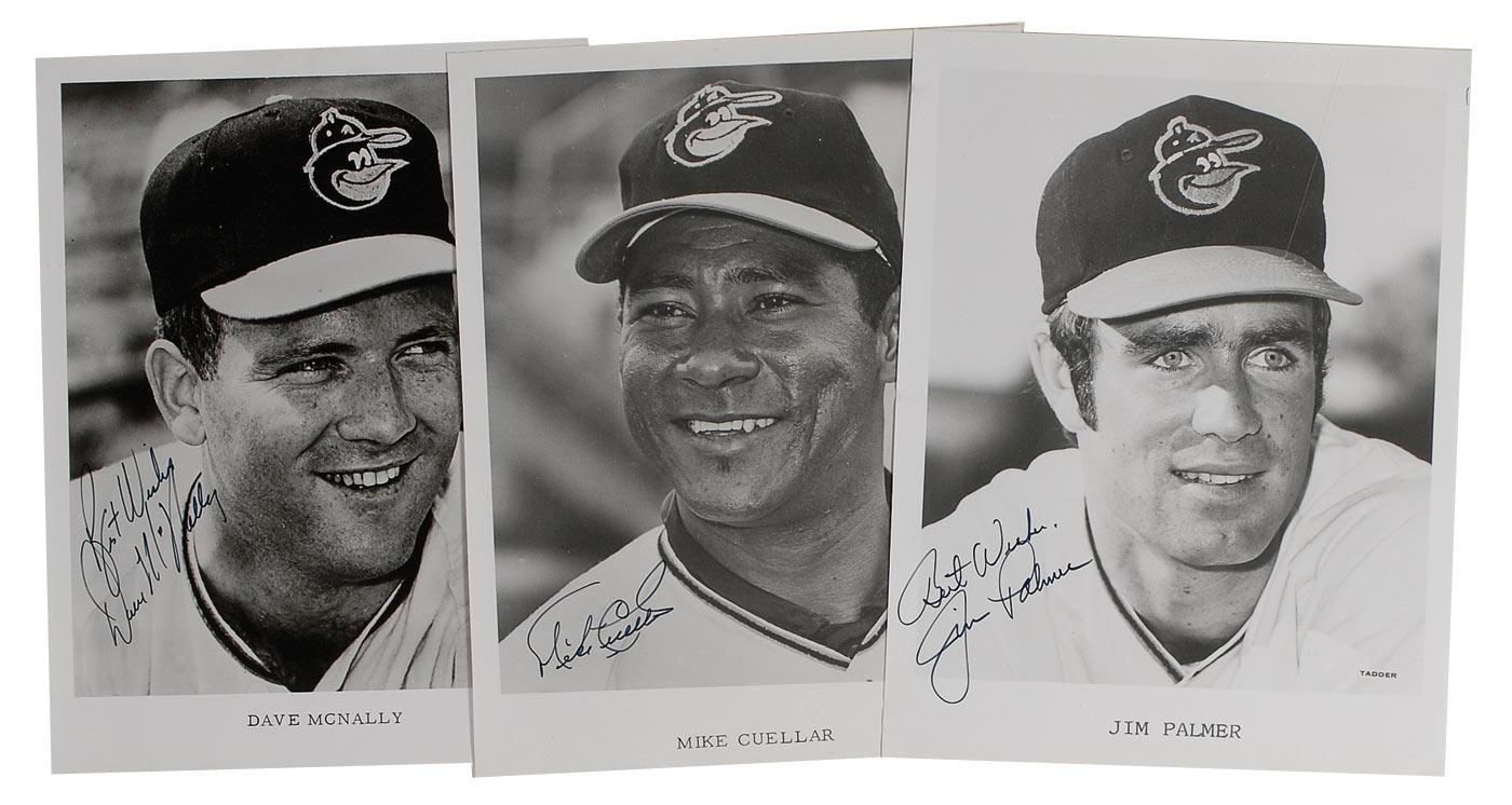 Three glossy 8 x 10 photos, each signed in black felt tip by the respective Oriole pictured. Signers are: Jim Palmer, Dave McNally, and Mike Cuellar. In fine condition, with some scattered light creases and binder dings to edges of two photos.
