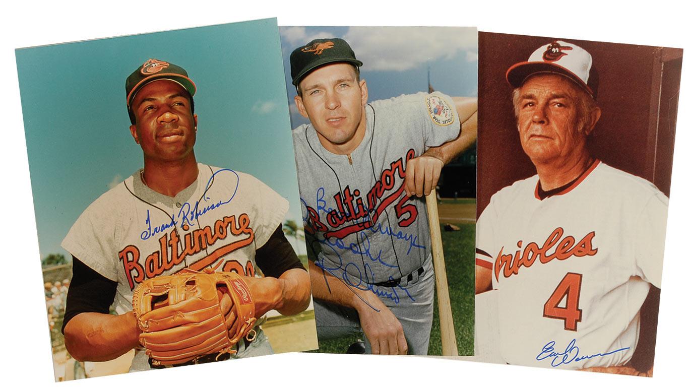Three color 8 x 10 photos, two glossy and one satin-finish, each signed in blue felt tip by the respective Hall of Fame Oriole pictured: Brooks Robinson, Frank Robinson, and Earl Weaver. In fine condition.