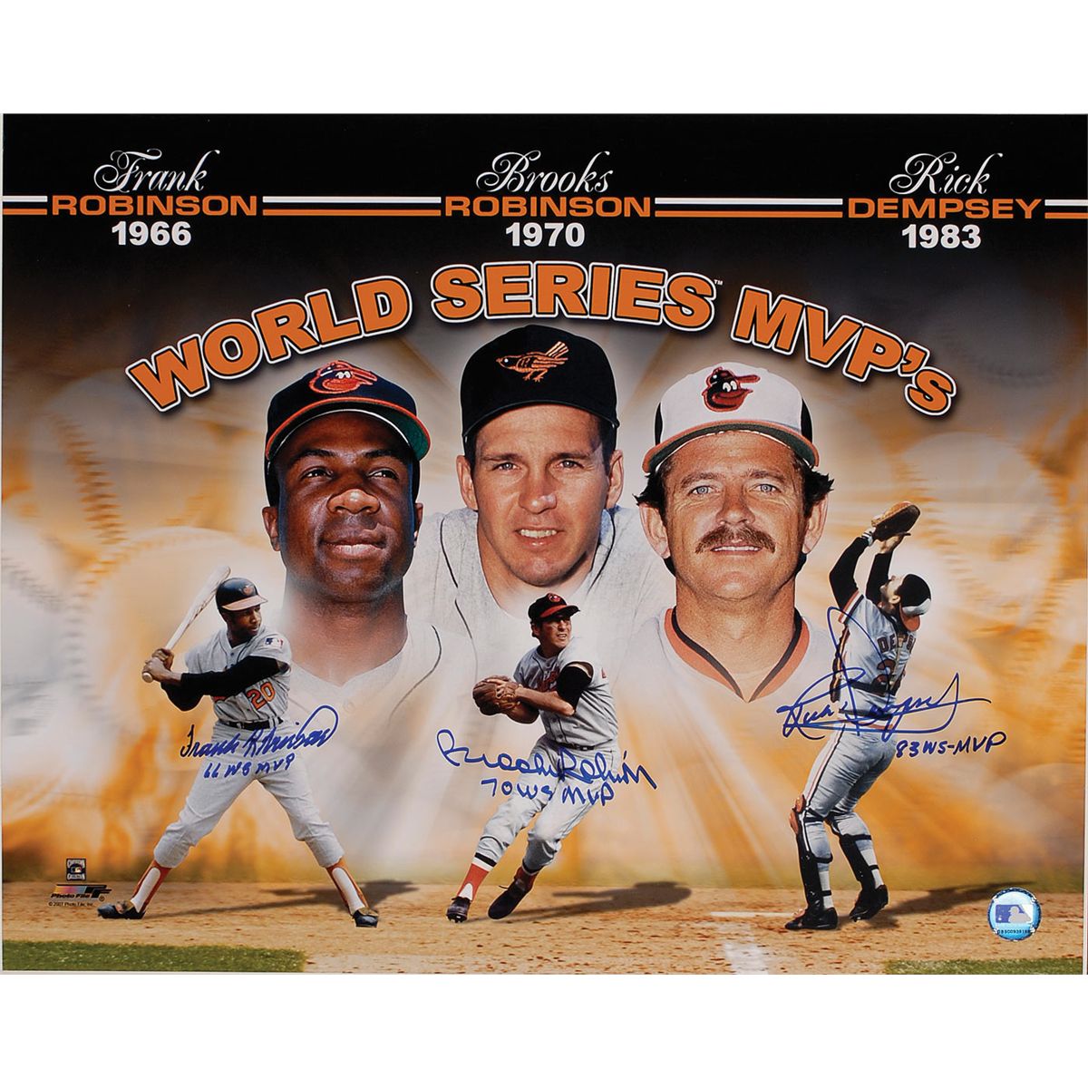 Color glossy 20 x 16 composite photo of the three Orioles World Series MVPs, signed in blue felt tip by all three: Frank Robinson, Brooks Robinson, and Rick Dempsey. Photo is affixed to an identical size piece of foam core. In fine condition. Each player has added his respective World Series MVP year (66 WS MVP, 70 WS MVP and 83 WS MVP, respectively). A unique piece with all three Orioles (including two Hall of Famers) notating their accomplishment.