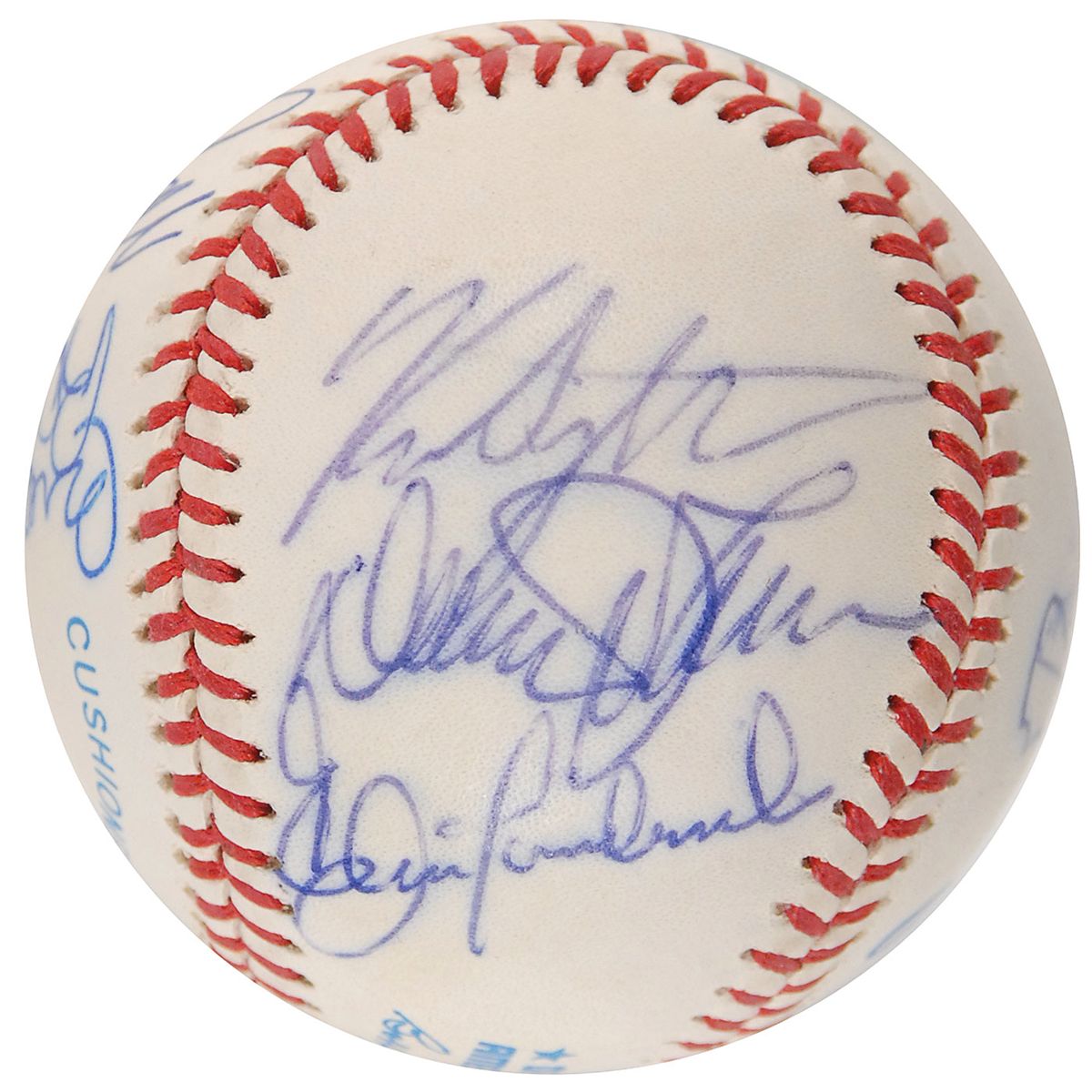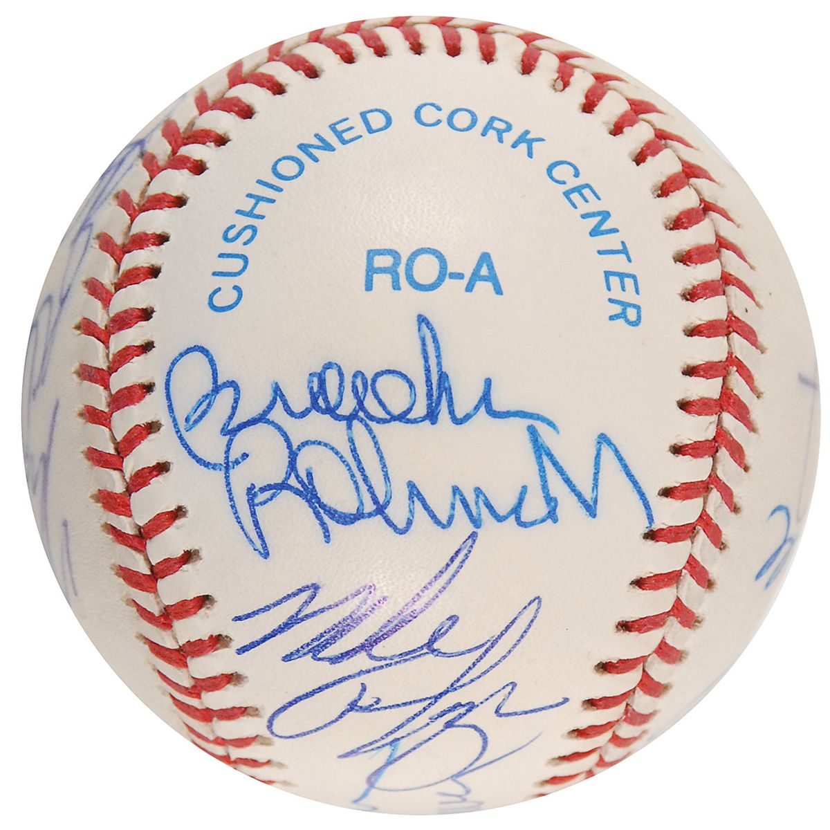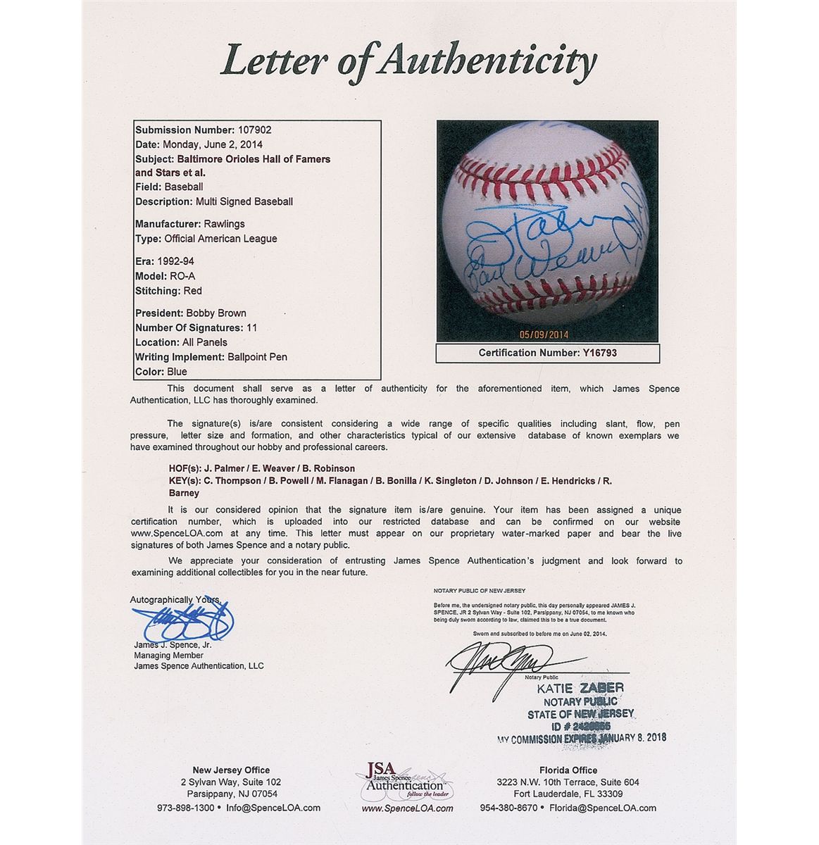 Official Rawlings American League baseball signed in blue ballpoint on the sweet spot and side panels by 11 members of past Baltimore Orioles teams, including: Earl Weaver (ss), Jim Palmer (ss), Brooks Robinson, Boog Powell, Davey Johnson, Ken Singleton, Bobby Bonilla, Elrod Hendricks, Mike Flannigan, Chuck Thompson, and Rex Barney. In fine condition, with slight spreading to ink of some signatures and a JSA label affixed to a side panel. Accompanied by a full letter of authenticity from JSA.