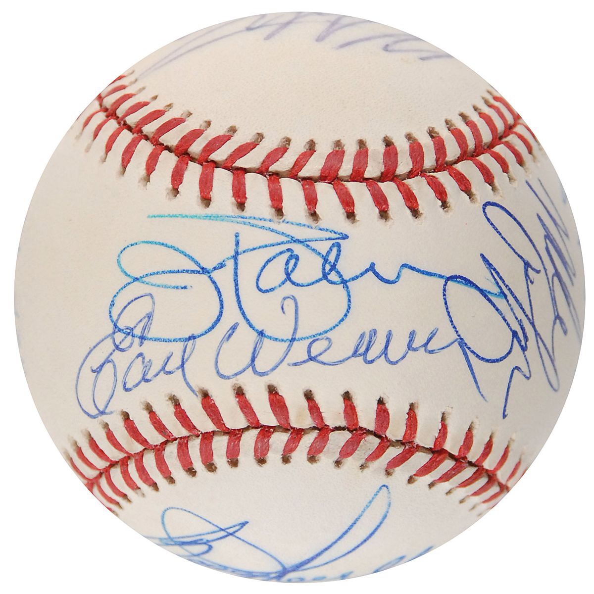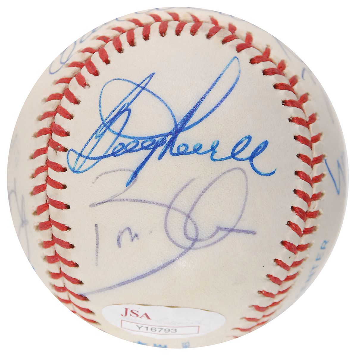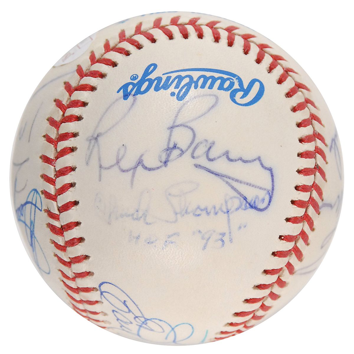 Official Rawlings American League baseball signed in blue ballpoint on the sweet spot and side panels by 11 members of past Baltimore Orioles teams, including: Earl Weaver (ss), Jim Palmer (ss), Brooks Robinson, Boog Powell, Davey Johnson, Ken Singleton, Bobby Bonilla, Elrod Hendricks, Mike Flannigan, Chuck Thompson, and Rex Barney. In fine condition, with slight spreading to ink of some signatures and a JSA label affixed to a side panel. Accompanied by a full letter of authenticity from JSA.