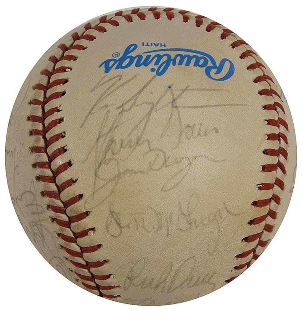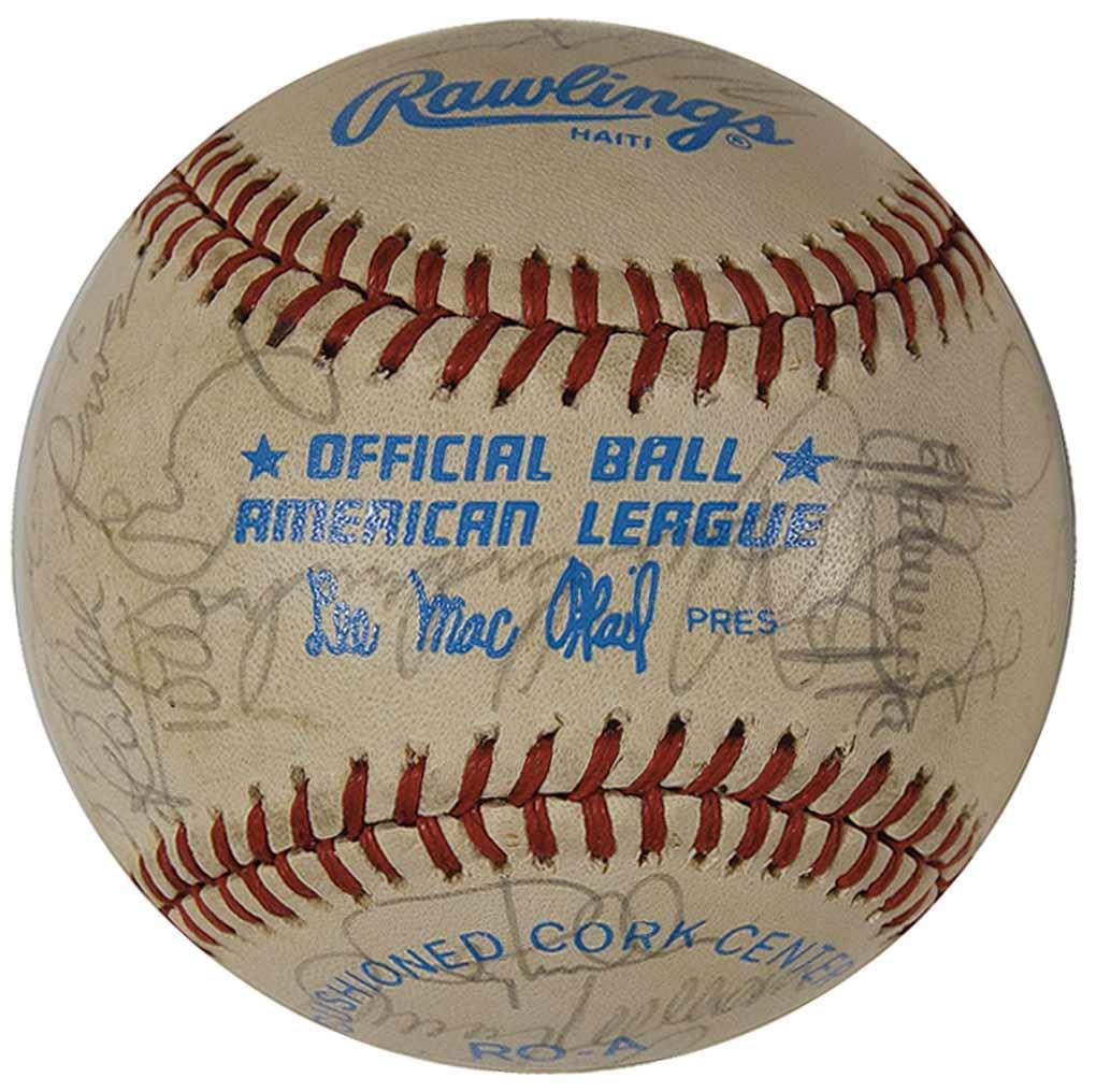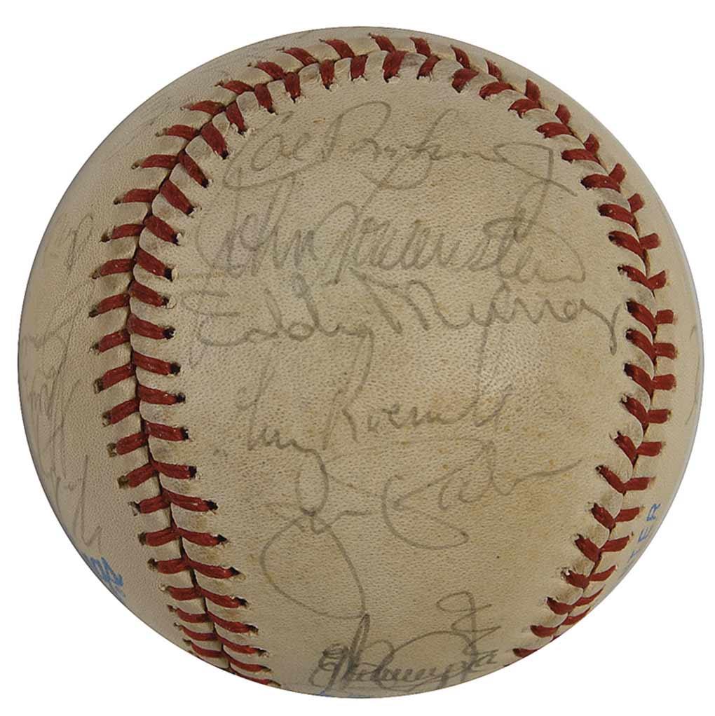 Official Rawlings American League baseball signed in black ballpoint by 26 members of the 1983 World Champion Baltimore Orioles. Signers include: Joe Altobelli (ss), Cal Ripken, Jr., Eddie Murray, Jim Palmer, Tippy Martinez, Mike Young, John Shelby, Joe Nolan, Storm Davis, Al Bumbry, Sammy Stewart, Jim Dwyer, and Rick Dempsey. All signatures a shade or two light, but completely legible, and light overall soiling, otherwise fine condition.