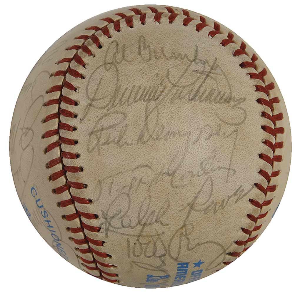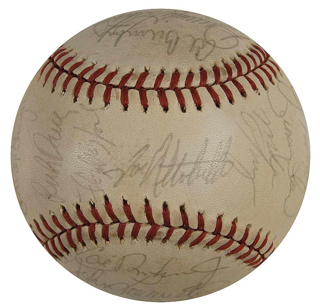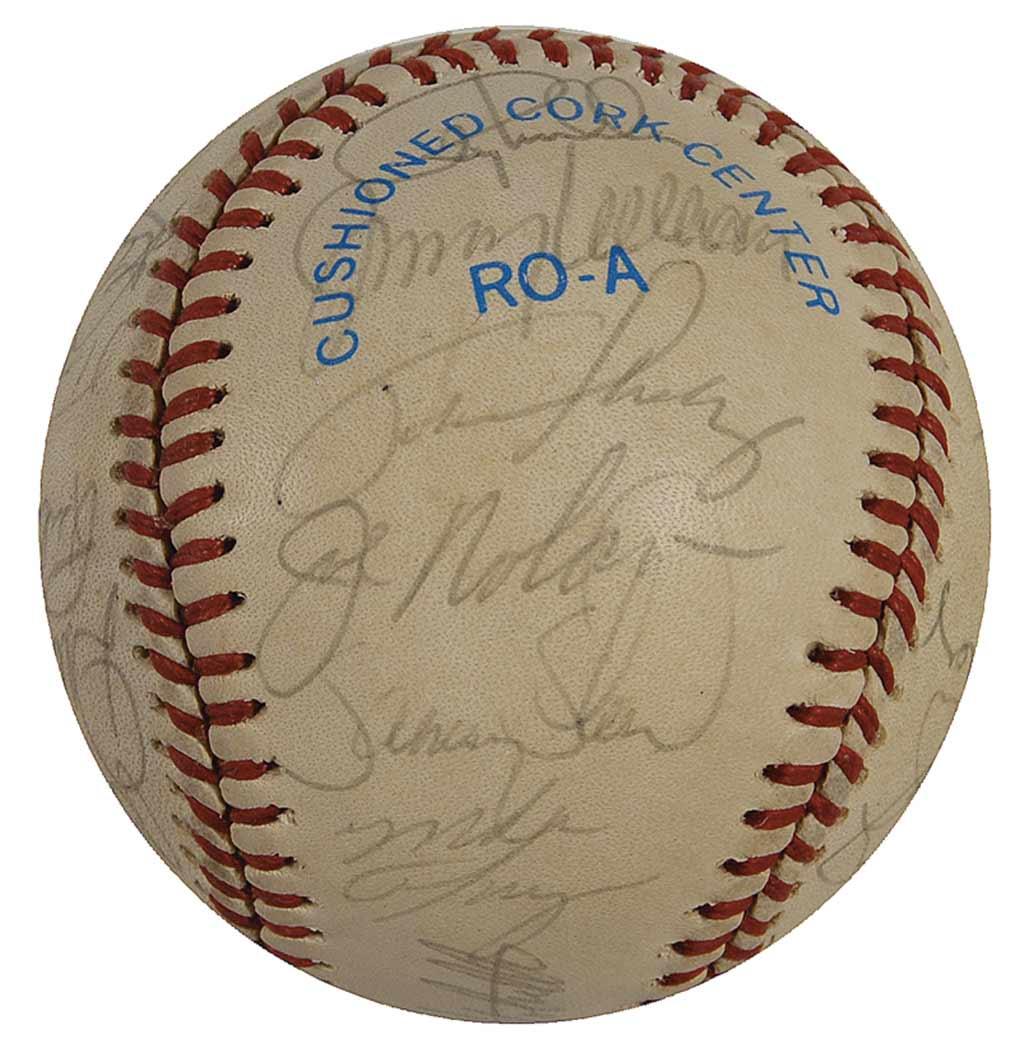 Official Rawlings American League baseball signed in black ballpoint by 26 members of the 1983 World Champion Baltimore Orioles. Signers include: Joe Altobelli (ss), Cal Ripken, Jr., Eddie Murray, Jim Palmer, Tippy Martinez, Mike Young, John Shelby, Joe Nolan, Storm Davis, Al Bumbry, Sammy Stewart, Jim Dwyer, and Rick Dempsey. All signatures a shade or two light, but completely legible, and light overall soiling, otherwise fine condition.