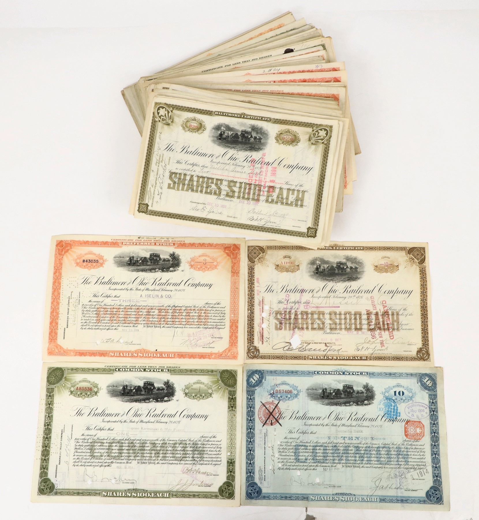Lot of approx. (+200) stock certificates, issued by "The Baltimore and Ohio Railroad Company," incorporated in 1827. There are (3) color variations in this group, all are punch cancelled. The earlier-appearing certificates have a unique central vignette not seen previously. The other versions feature a left side patriotic vignette. Reverse sides are executed, many with revenue stamps and attached receipts. Overall condition is good to very good, please see photos.