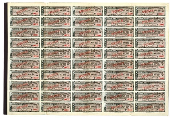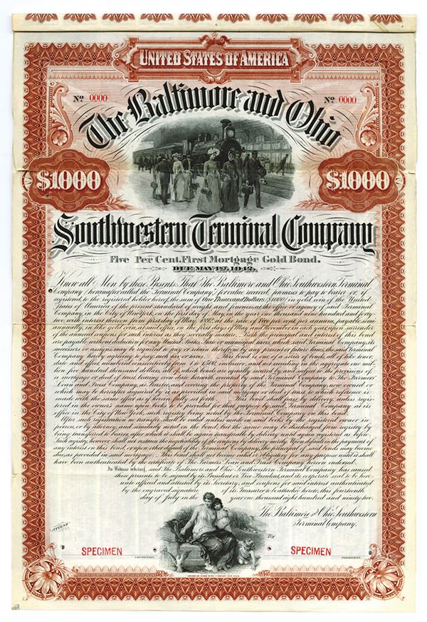 $1000, Specimen 5% 1st Mortgage Gold Coupon Bond. Stunning design and colors with curved title over terminal scene with locomotive, passengers and women at top with seated allegorical woman and children at bottom, burgundy brown border and under print enhance this lovely design. This was the only example found in the ABN archives in 2002, it is unlisted in Cox and it is the only one available. ABNC.