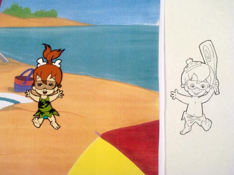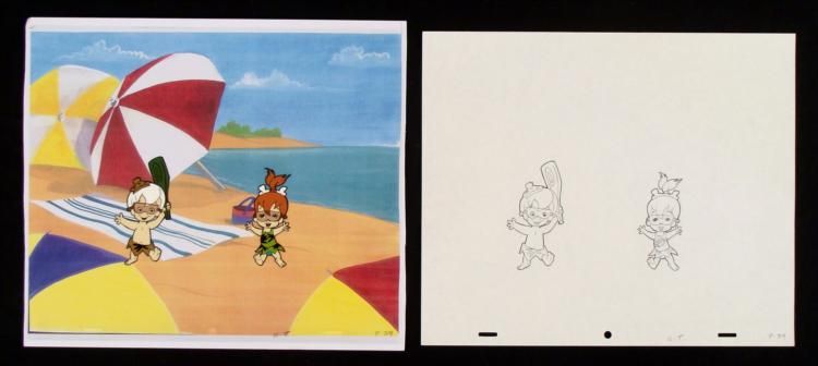 Here, Bam Bam and Pebbles are having some fun under the nice, beautiful sun. The cel comes with a matching drawing overlay. * * Original Production Art Cel, Drawing, and Reproduction Background Original "rough" animation drawing, with notations in black. Bam Bam and Pebbles have been outlined in black. Overall Size of the Cel: 10 1/2" x 12 1/2" Overall Size of Reproduction Background: 11" x 13 1/4" * Excellent condition This is an original hand-painted cel set-up used in the production of an episode of "The Flintstones." Each one-of-a-kind set-up represents a slight change in position of the characters. When individually photographed and projected in rapid succession, the images appear to move. * To create production cels, the original animator's drawing is transferred onto an acetate cel (by hand-inking and/or photo copying). The cel is then hand-painted on the reverse side. The background accompanying this set-up is a reproduction background. * * The cel, drawing, and background are ready to be matted and framed. The animator's notations are shown at the bottom of the cel and drawing. *