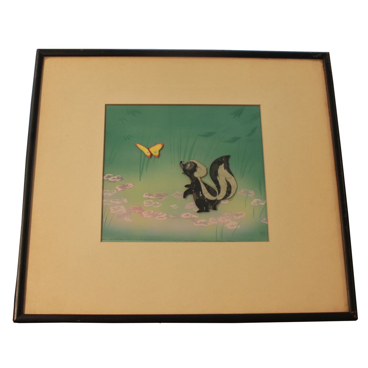 Rare 1937 animation cel from Walt Disney's ''Bambi,'' one of the most beloved animated movies of all time. This cel, showing the skunk Flower chasing a butterfly is an especially delightful scene from the movie, which, though started in 1937, wasn't released until 1942 due to production problems. Cel measures 7.75'' x 7'', housed in the original frame from the Courvoisier Gallery, one of the first to sell animation art. Cel is stamped WD within a circle at the lower right corner. Some cracking to Flower's image, but no loss. Very good.
