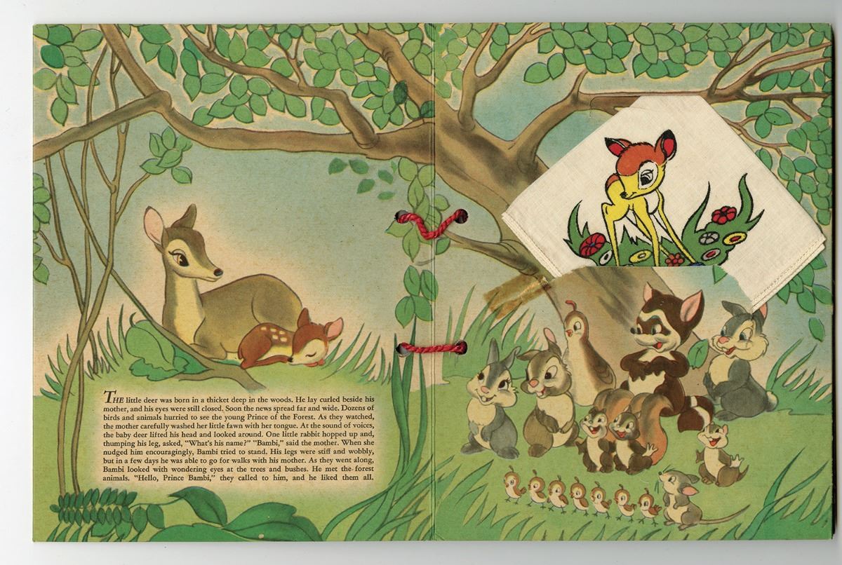 (Walt Disney Productions, 1941-42) An illustrated "Bambi" storybook containing (4) hankies of the characters Bambi, Owl, and two of Flower. Book measures 9.25"x7.2". In very good condition with some edge-wear.