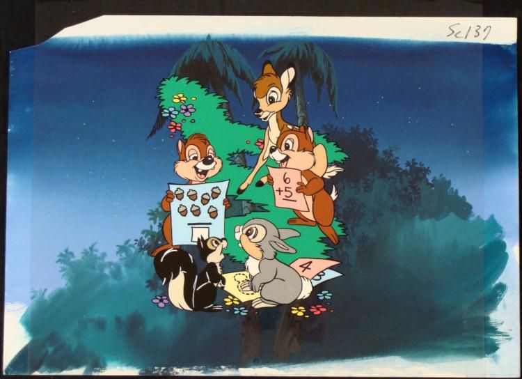 Bambi and his friends are learning how to do some math problems * * * Original Production Background and Animated CelMedium: Hand painted acetate celDetails: Numbers and peg holes * * Size of Cel: 10 1/2 x 12 1/2 inchesSize of Background: 10 x 14 inches * * Condition: Very Good * This is an original hand-painted cel set-up used in the production of "Bambi." Each one-of-a-kind set-up represents a slight change in position of the characters. When individually photographed and projected in rapid succession, the images appear to move. * * To create production cels, the original animator's drawing is transferred onto an acetate cel (by hand-inking and/or photo copying). The cel is then hand-painted on the reverse side. The background accompanying this set-up is a hand-painted original production * background. *