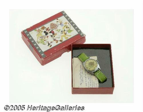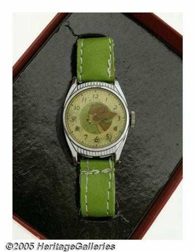 <B>Bambi Wrist Watch with Box (US Time Corporation, 1949).</B></I> Store item by US Time Corporation. It comes with a green band in great condition, the face has some discoloration and a loose crystal. Comes complete in the original box. Overall grade is Very Good to Fine. <I>From the Larry Jacobs Collection.</B></I>