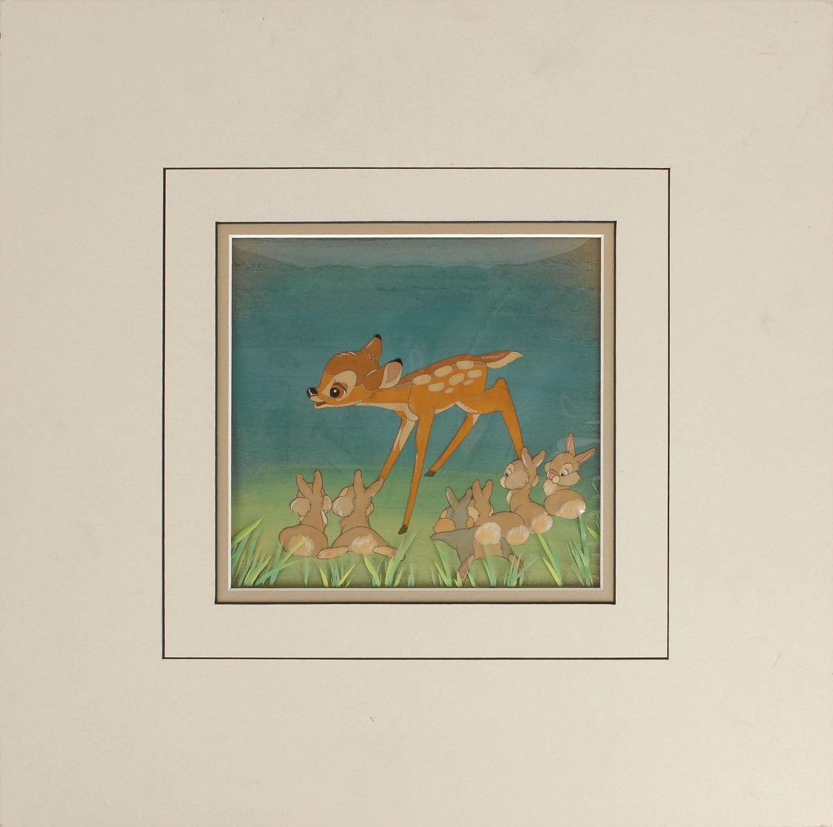 (Walt Disney Studios, 1942) Original production cel featuring Bambi and six cute little bunnies from Bambi, showing the fawn surrounded by her friends in a forest clearing. The cel has been trimmed and applied to a hand-painted background as prepared by Courvoisier Galleries for sale. Bambi image measures 4 x 3.5 and each bunny about 1.5 x 1, with a mat opening of 6.75 x 6.25. Mat dimensions are 15.25 x 14.75. In fine condition.