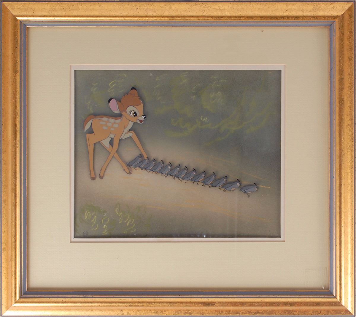 (Walt Disney Studios, 1942) Original cel and background featuring Bambi and Quails from Bambi, showing the white-tailed deer following a line of quail chicks. The cel has been trimmed and applied to a hand-painted background as prepared by Courvoisier Galleries for sale. Image measures 8 x 5.25, with a mat opening of 10 x 8. The reverse of the mat bears a Walt Disney Productions copyright stamp. This piece is also framed to an overall size of 17 x 15.25. In fine condition, with trivial rippling to edges.