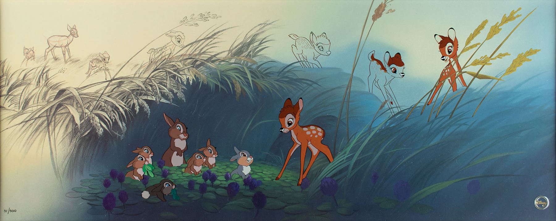 (Walt Disney Studios, 1998) Original limited edition hand-painted cel entitled 'Good Morning, Young Prince,' numbered 51/500, showing Bambi bounding through the meadow to meet up with his bunny friends. The cel is placed on its matching Disney litho background. Images range in size from 1 x 1 to 3 x 4.5, with a mat opening of 29 x 11.5. Framed to an overall size of 39.5 x 21.75. The piece has the silver Walt Disney Company seal to lower right. In fine condition. Accompanied by a certificate of authenticity from Disney Enterprises, Inc.