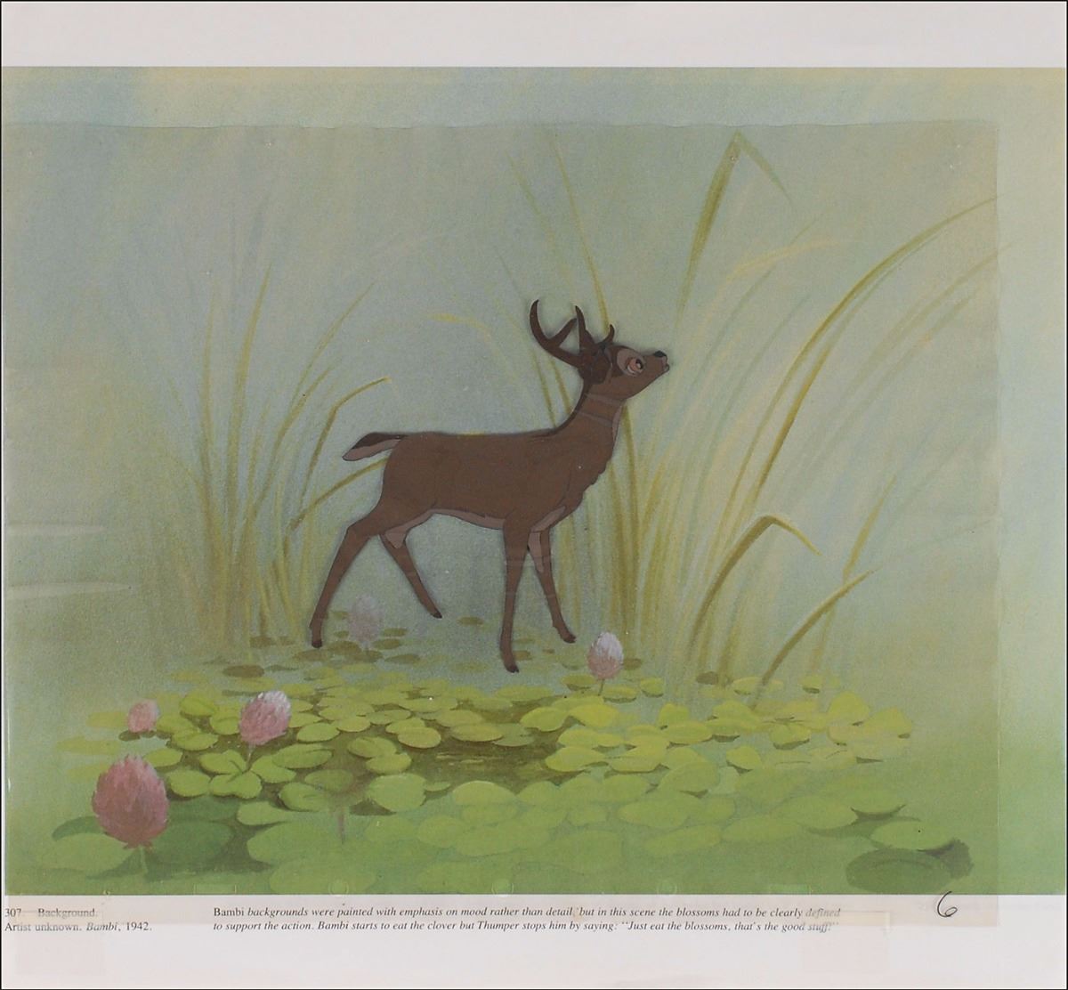 (Walt Disney Studios, 1942) Original production cel featuring Bambi from Bambi, showing the title character as an adult. The cel is placed on a color copy background removed from a book. Image measures 4 x 4.5, with overall dimensions of 12.5 x 12. In fine condition, with mild rippling to celluloid.