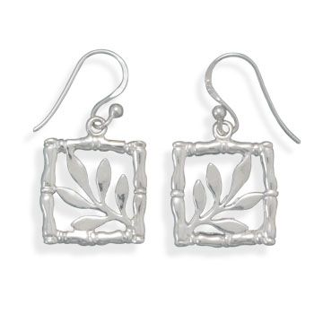 Sterling silver 17mm square bamboo and leaf design drop french wire earrings. .925 Sterling Silver