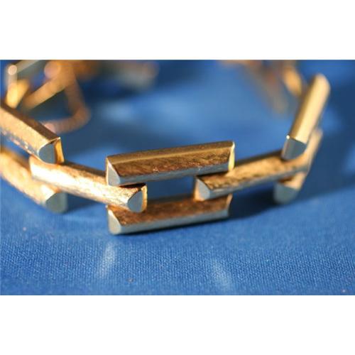 This is a great, chunky retro gold link bracelet. Crafted of 35.8 grams of 14K gold, this bracelet features links textured in a florentine finish. The links have shiny ends. The shape and finishes combine to create somewhat of a bamboo look. The bracelet is 7.5 inches long and the links are just under 3/4 inch wide. The clasp and safety chain work great. There are a couple of small dings to the underside. Overall, in great condition and really a terrific look!!