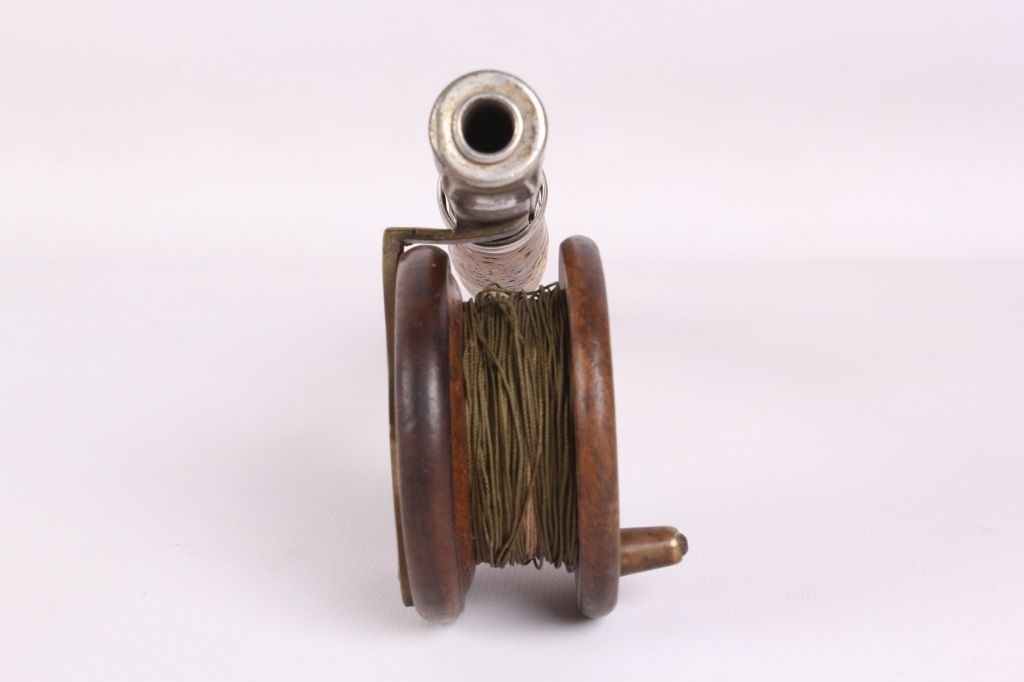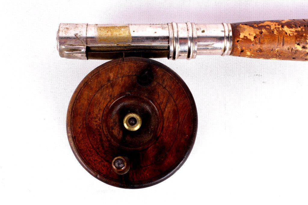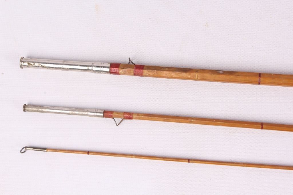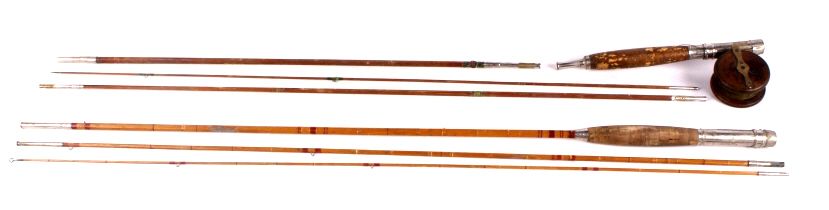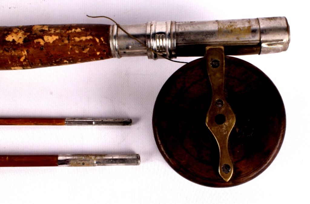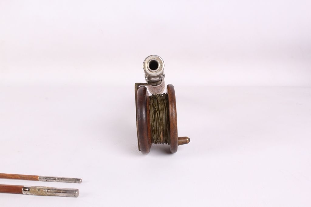 This lot includes 2 bamboo fly rods. One has a wooden fly reel on it. The same rod has a tip that needs repair. The other is complete and in good condition. The rods measure 9' and 9.5".