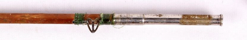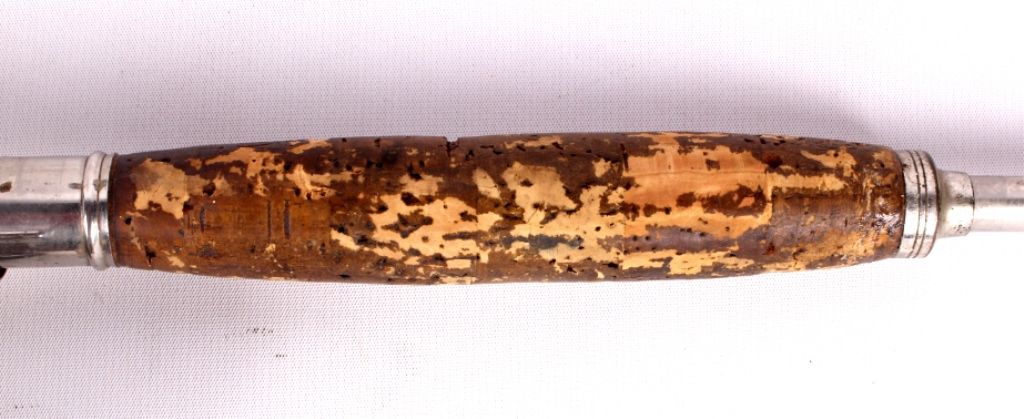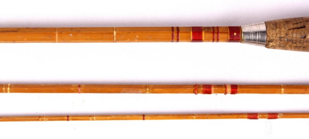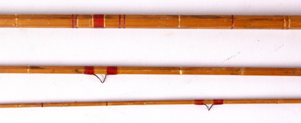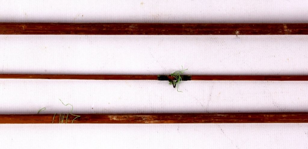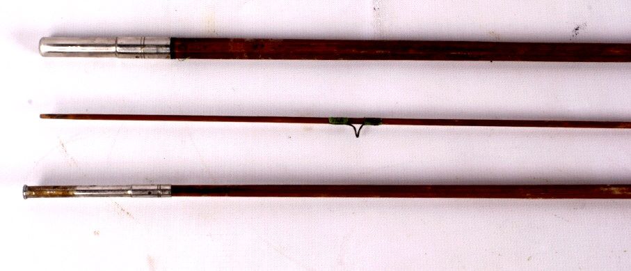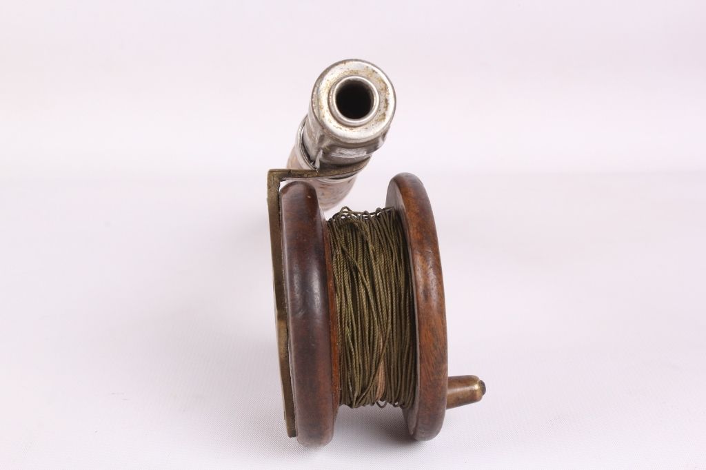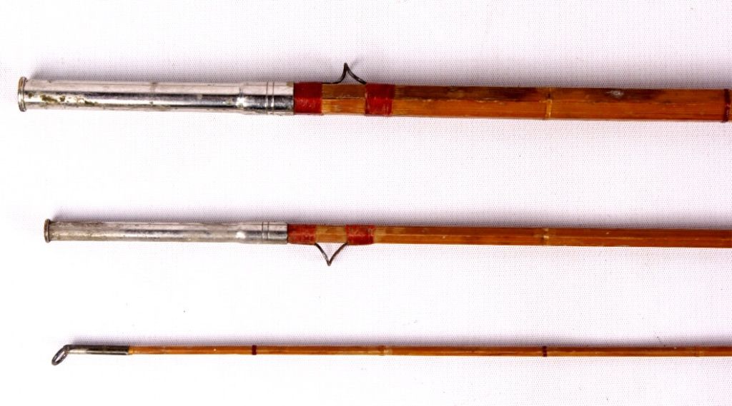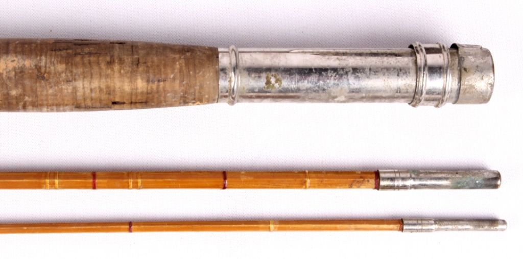 This lot includes 2 bamboo fly rods. One has a wooden fly reel on it. The same rod has a tip that needs repair. The other is complete and in good condition. The rods measure 9' and 9.5".