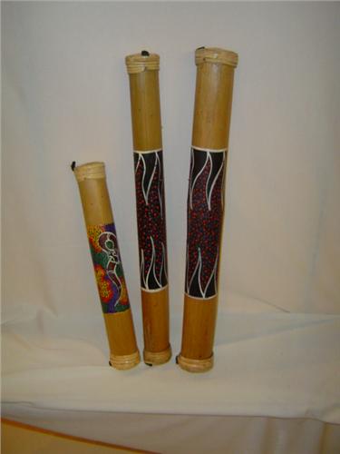 Indonesian Rain Sticks (two at 24" and one at 16"), bamboo with australian aboriginal design, hand-painted