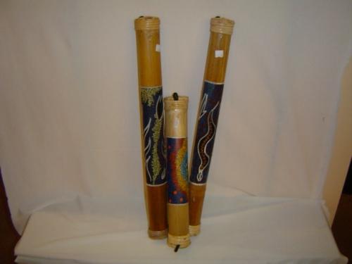 Indonesian Rain Sticks (two 24"and one 16"), bamboo with australian aboriginal design, hand-painted
