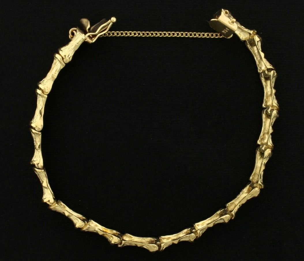 In 14k yellow gold. 7" long and 5.3mm thick with safety chain and clasp. 14.4g.