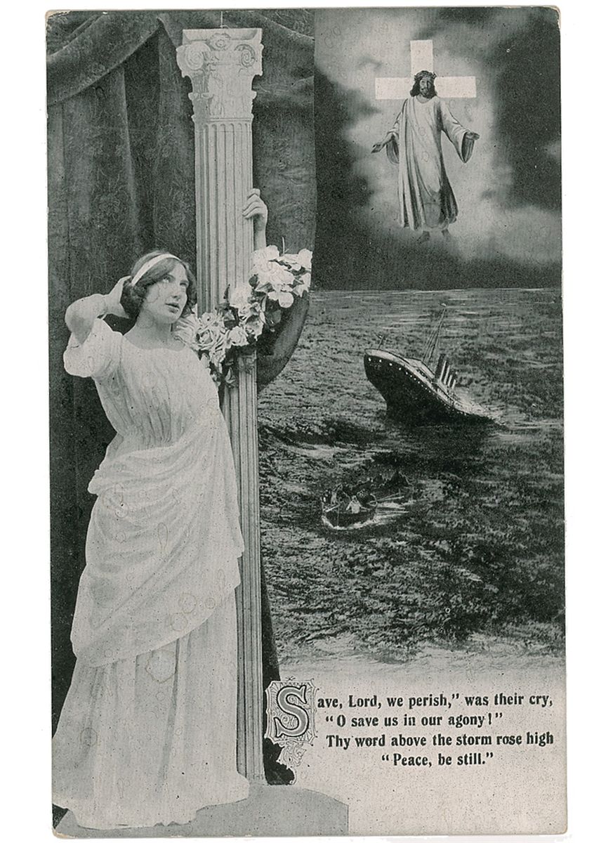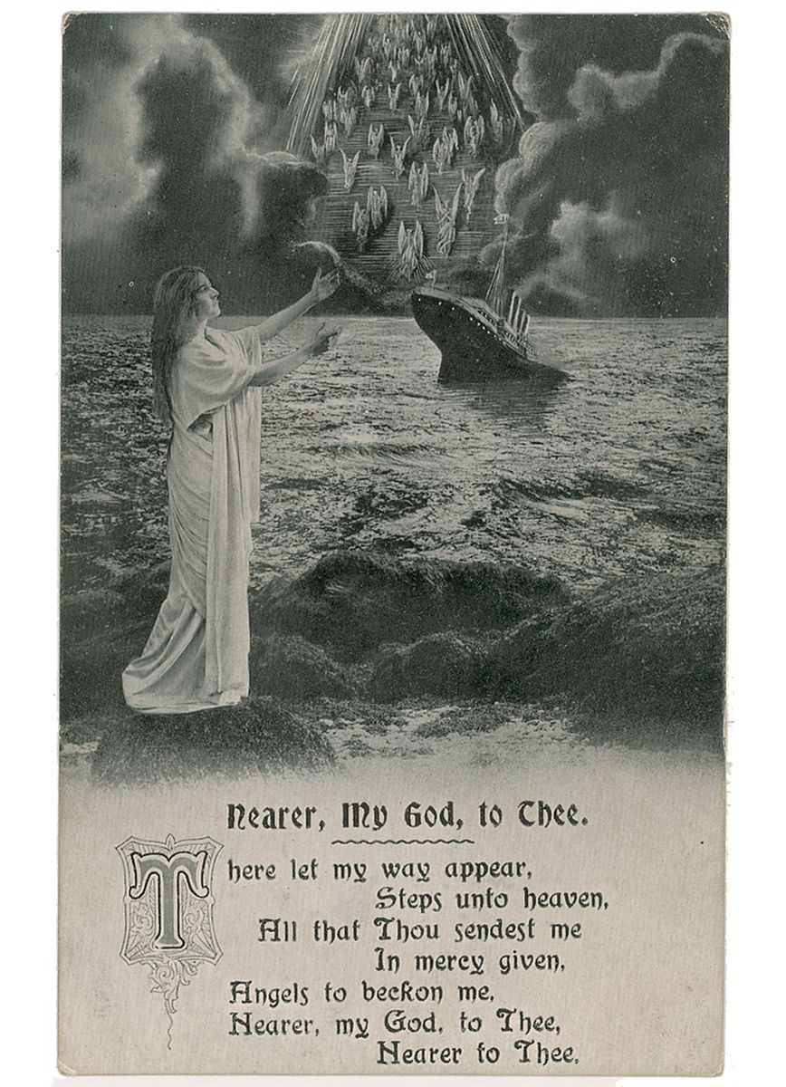 Complete set of six Bamforth & Co. Ltd. postcards depicting the Titanic’s sinking: ‘Nearer, My God, To Thee’ music over the ocean with sinking ship; kneeling female wearing a white robe with the words to the song on the bottom, vertical image; same female standing against a column with flowers, an image of Jesus in the clouds in front of a lighted cross with the sinking ship in the ocean and a lifeboat in the foreground, vertical image; horizontal image of same female with closer image of Jesus, the words “Nearer, My God, To Thee” hovering over the ocean and reflected in the water; the words “Nearer, My God, To Thee” appearing in the sky over a lighted cross with the sinking ship in the ocean with six lifeboats in the water; robed female with lighted cross in the sky and ship sinking in the water, the first verse of ‘Nearer, My God, To Thee’ on the bottom, vertical image; and a robed female with arms lifted to the heavens where angels can be seen ascending into the clouds above the sinking ship in the ocean.