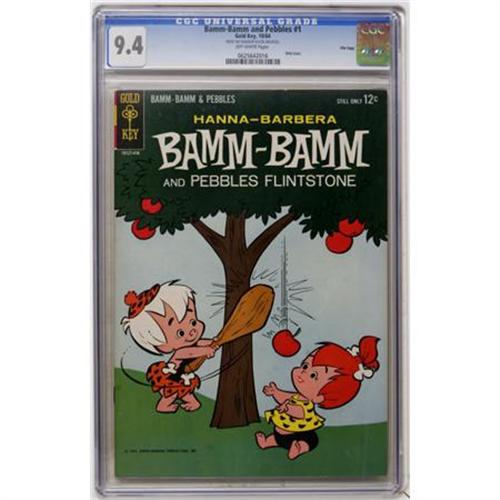<B>Bamm-Bamm and Pebbles Flintstone #1 File Copy (Gold Key, 1964) CGC NM 9.4 Off-white pages.</B></I> Only issue of this title. CGC notes, "From the Random House Archives." Overstreet 2007 NM- 9.2 value = $140. CGC census 9/07: 6 in 9.4, 1 higher.<BR><BR><b>Shipping:</b> Comics - Slabbed (certified) (<a target="_blank" href="http://www.heritageauctions.com/common/shipping.php">view shipping information</a>)